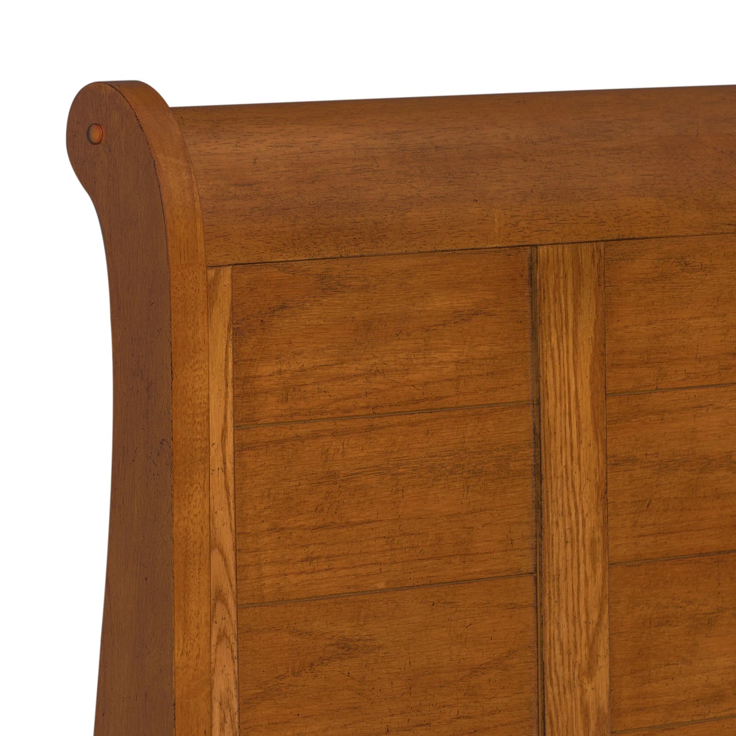 Staple any room with this rustic American style sleigh bed. Constructed of rubberwood solids and oak veneers, this piece features an aged oak finish, scrolled headboard and footboard, horizontal planked design on headboard and footboard, center slat supports, and a bolt on rail system. With wood and peg accents, this bed is sure to bring uniqueness and functionality to any room, allowing for a craftsman feel.