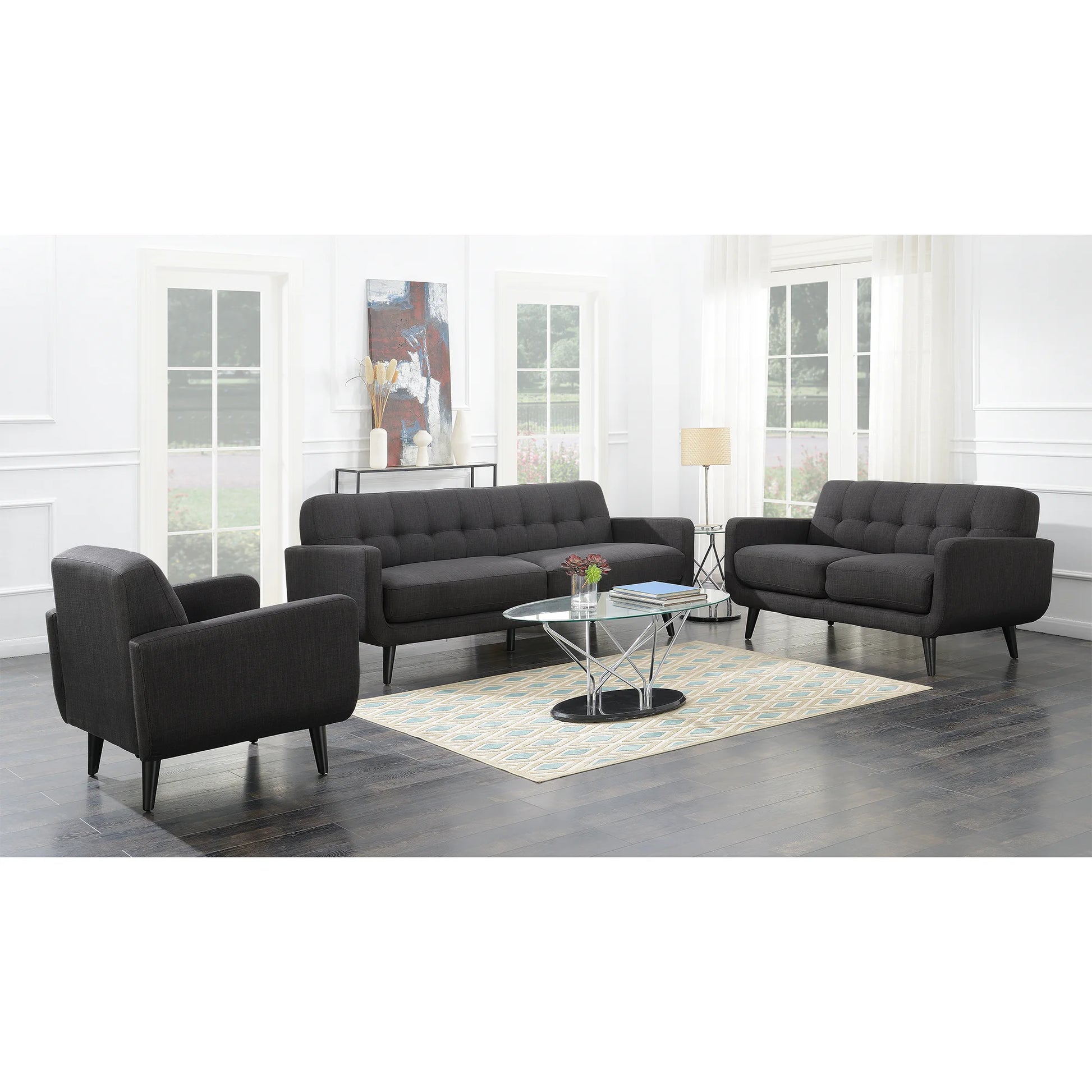 The Hadley 3PC Sofa Set is where modern design meets vintage flair. This set comes with a sofa, loveseat and chair, making it the perfect trio for your living room. Perfect for relaxing in style, this stylish set features precise tufting on the back cushions. This set features low arms, adding the perfect amount of modern design. The seat and back cushions are filled with foam, so you can relax for hours at the end of the day. The mid-century style tapered legs complete the look of this vibrant set.