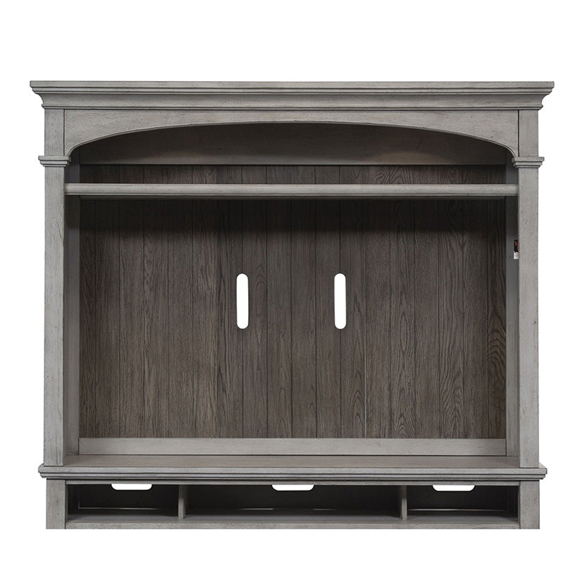 Crafted of rubberwood solids with cathedral white oak veneers. Finished in an antique white with a tobacco finish back panel. Features LED touch lighting, planked design back panel, adjustable shelf, and wire management provision to conceal wiring. Pair with the left pier, right pier, and console to make a complete wall.