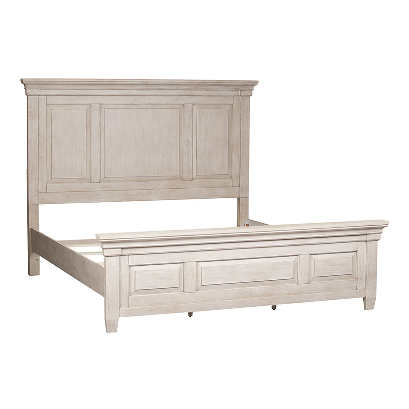 Fall into this farmhouse style Heartland panel bed. Crafted with rubberwood solids and oak and birch veneers, the antique white finish features artistic distressing, which gives this piece unique characteristics in line with an antique appeal. Heavy top crown molding and raised panels on the headboard and footboard complete this farmhouse look. Never question the reliability of the bed due to the bolt-on rails and center supported slat system.