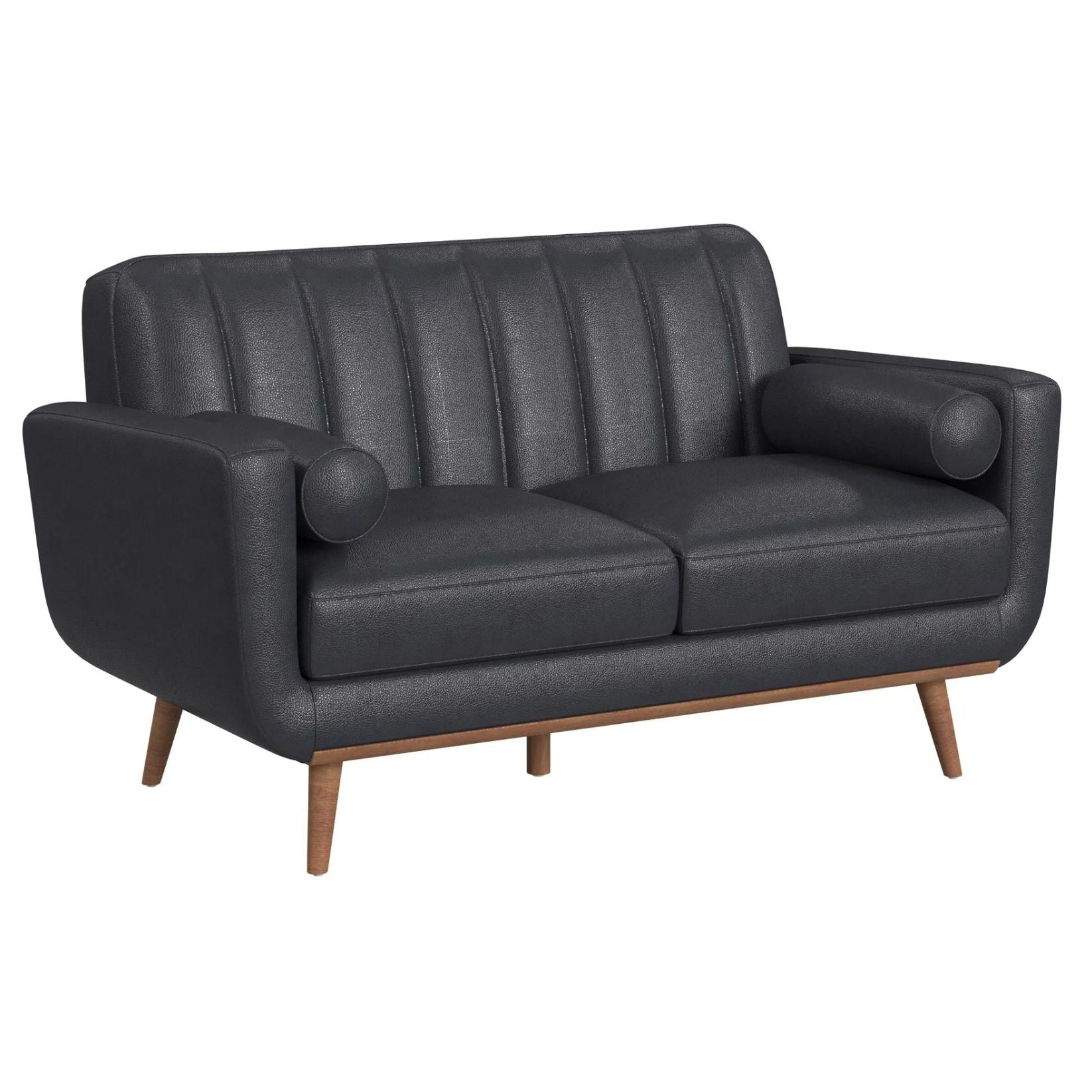 The Horizon Loveseat with Wood Front and 2 Six Inch Bolster Pillows exudes the coveted charm of mid-century modern style. Built with a frame fully upholstered in quality faux leather, this piece is built for durability. Comfortable foam cushioning, decorative tufting on the backrest, and track arms forming sleek and modern lines culminate to mark thoughtful design, while an exposed front rail and wood legs highlight excellent craftsmanship. For a refined and sleek addition to your living space, the Horizon Loveseat with Wood Front delivers in quality and style.