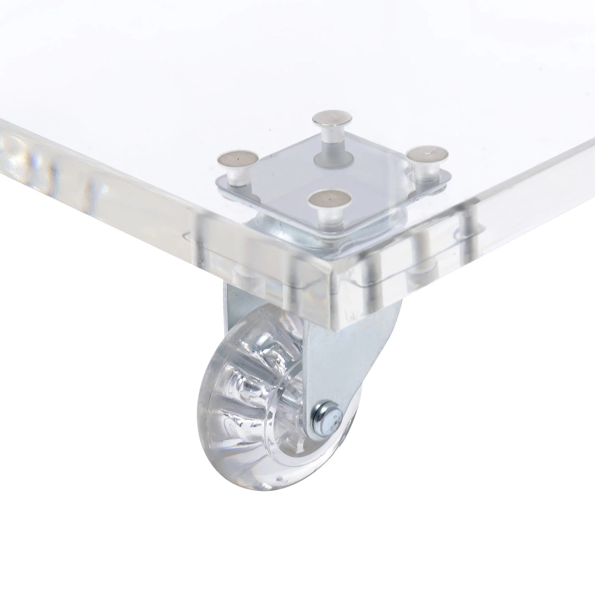 The Iris Acrylic Snack Table is the missing piece to your home! This table comes on clear casters. Dont worry if casters arent your style, they can easily be removed. Roll this snack table with ease up to your sofa and find a spot for your drinks and snacks while you binge watch your favorite shows. The shelf on the bottom lets you add your personal style with any of your favorite decor. The entire table is made out of clear acrylic, making it permanent staple in your home year after year.