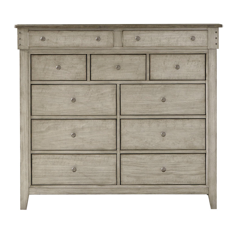 Live life beautifully with the Ivy Hollow dresser. Crafted of poplar solids with pine and alder veneers, this piece features dusty taupe tops with a weathered linen base that is heavily distressed with saw marks. This chesser offers eleven full extension drawers with premium felt lined top and cedar lined bottom drawers. The top drawers are offset for added dimension which flow into tapered feet. Framed end panels create a nice side view. Pin nail accents and antique pewter knob hardware add character to the front of the case. Inviting and inspirational, Ivy Hollow offers a look and design style that works for cottage or contemporary and is more about creating a look that we love.