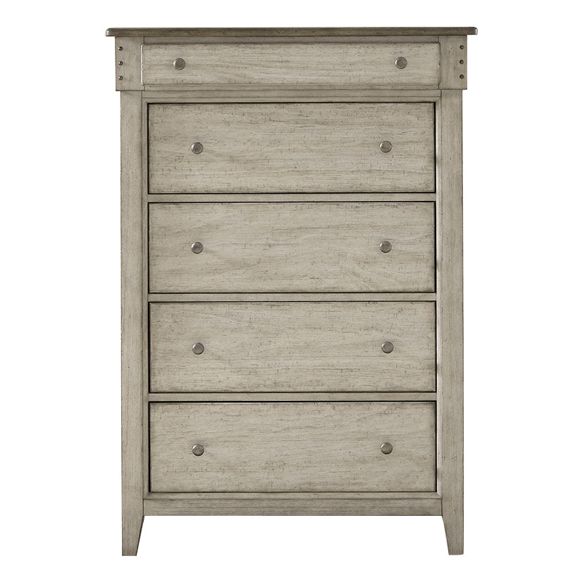 Live life beautifully with the Ivy Hollow chest. Crafted of poplar solids with pine and alder veneers, this piece features dusty taupe tops with a weathered linen base that is heavily distressed with saw marks. The chest offers five full extension drawers with premium felt lined top and cedar lined bottom drawers. The top drawers are offset for added dimension which flow into tapered feet. Framed end panels create a nice side view. Pin nail accents and antique pewter knob hardware add character to the front of the case. Inviting and inspirational, Ivy Hollow offers a look and design style that works for cottage or contemporary and is more about creating a look that we love.