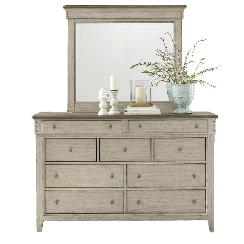 Live life beautifully with the Ivy Hollow dresser and mirror. Crafted of poplar solids with pine and alder veneers, this set features dusty taupe tops with a weathered linen base that is heavily distressed with saw marks. The dresser offers nine full extension drawers with premium felt lined top and cedar lined bottom drawers. The top drawers are offset for added dimension which flow into tapered feet. Framed end panels create a nice side view. Pin nail accents and antique pewter knob hardware add character to the front of the case. Attach the mirror with the included bolt-on supports that features a heavy top crown. The mirror has a beveled edge and pin nail head accents. Inviting and inspirational, Ivy Hollow offers a look and design style that works for cottage or contemporary and is more about creating a look that we love.