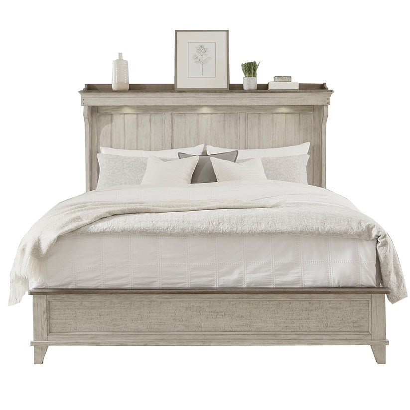 Create a relaxing retreat with the Ivy Hollow queen mantle bed. Crafted of poplar solids with pine and alder veneers, this bed features a heavily distressed weathered linen and dusty taupe finish with saw marks. The headboard has a shaped mantle crown with a gallery top and touch LED lighting illuminating planked panels. The panel footboard features a cap rail finished in dusty taupe that combines nicely with the weathered linen finish. With the bolt-on rails and center support slat system, this bed is sure to last. Inviting and inspirational, Ivy Hollow offers the farmhouse look and design style that works for cottage or contemporary and is more about creating a look that we love.