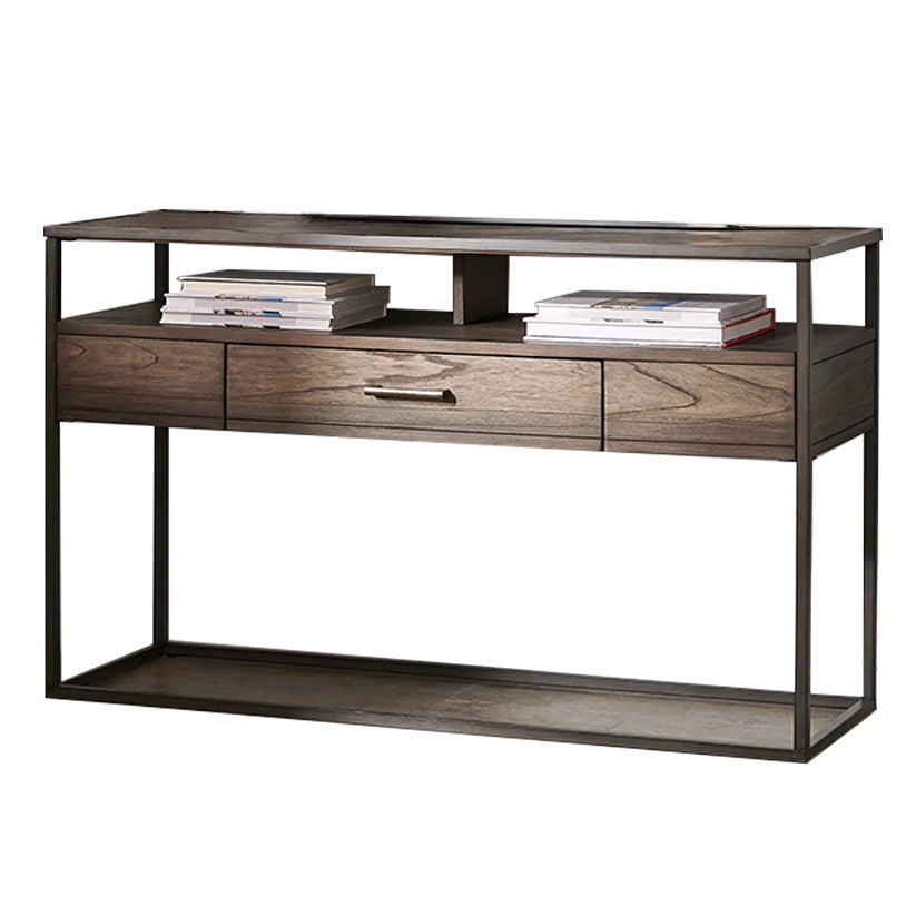 Simplify your urban space with the Jamestown sofa table. Crafted of rubberwood solids, metal tubes and mindy veneers, this piece features a tobacco finish, one full extension drawer, and an open shelf for additional storage. This modern sofa table would make a great addition to your contemporary space.
