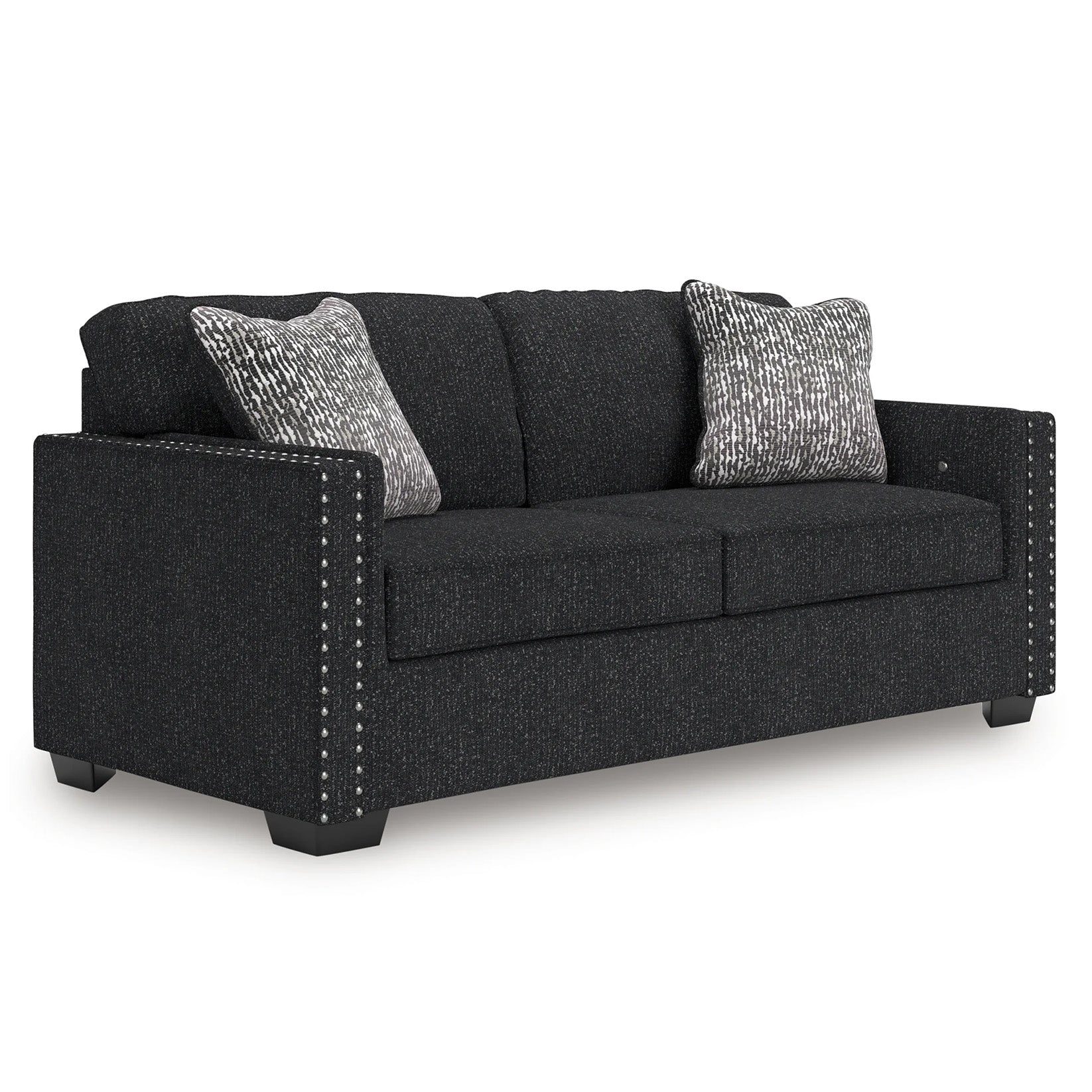 This stunning sofa leaves a lasting impression. Its cozy cushions, chic coal-colored upholstery and striking nailhead trim are a perfect blend of comfort and contemporary design. And here’s the showstopper—ambient red, white and blue LED lighting along the sofa's base. The look is simply wow.