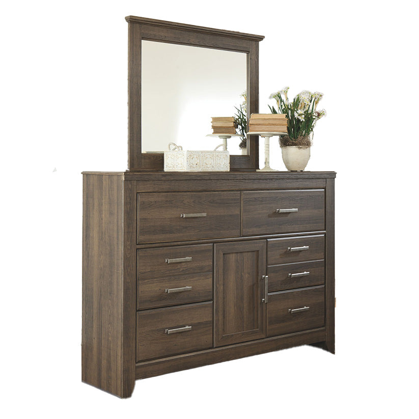Get the look of posh barn wood without setting foot in a salvage yard. Replicated rough-sawn oak of this dresser and mirror set has a vintage finish that is reminiscent of a timeworn family heirloom. Warm, rustic and naturally beautiful, it’s just got that ageless appeal. Sleek, mod pulls in a pewter tone are a snappy finishing touch.