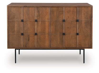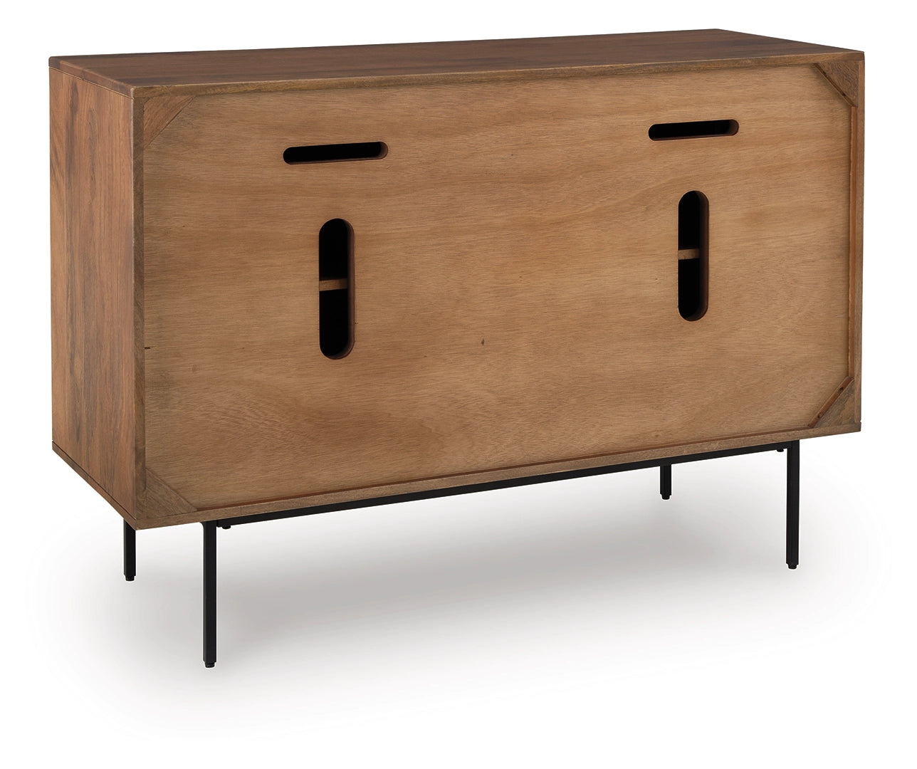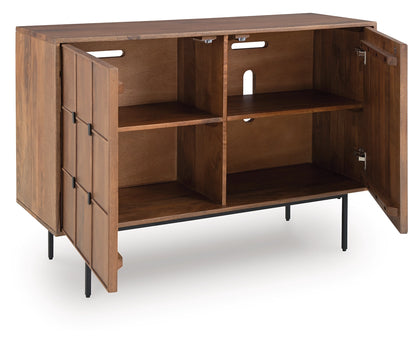 A step above the rest, this accent cabinet is so alluring and versatile. Push magnet doors with a captivating carved grid design open to reveal two interior shelves, keeping you organized in the most casually cool way.