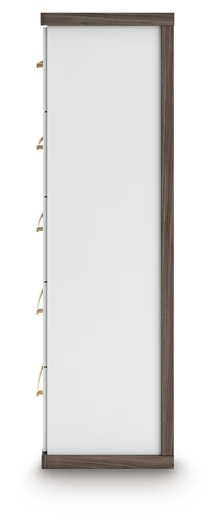 Looking to make a subtly striking statement in your bedroom? We've got you covered. This chest of drawers' sophisticated two-tone treatment marries a warm brown finish over replicated walnut grain with a matte white finish. Rounded corners and a thick top radiate an air of modern panache, while sleek handles in a champagne finish add a sparkling touch to the spacious drawers. It’s a master class in contemporary yet comfortable character.