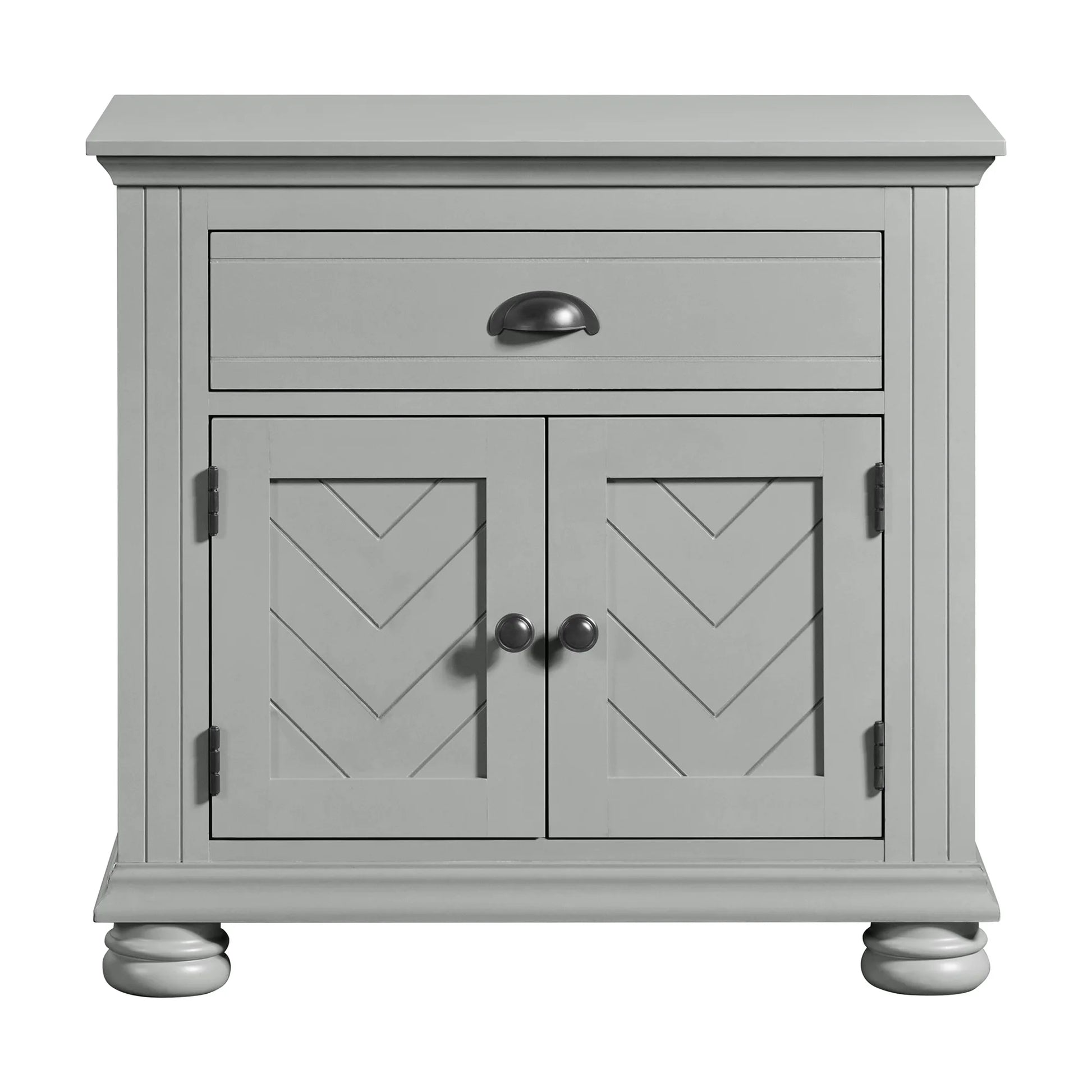 Introducing the Kona Nightstand, the perfect blend of style and functionality for your bedroom. The chevron pattern detail on the cabinet door fronts adds a touch of elegance, while the black knob and cup pull hardware give it a modern flair. The drawer is lined with felt to keep your belongings safe and secure, and the dust-proofing bottom layer ensures that this nightstand will last for years to come. With bun feet that elevate the nightstand off of the floor and a Kenlin drawer guide for smooth operation, the Kona Nightstand is the ideal addition to any bedroom decor.