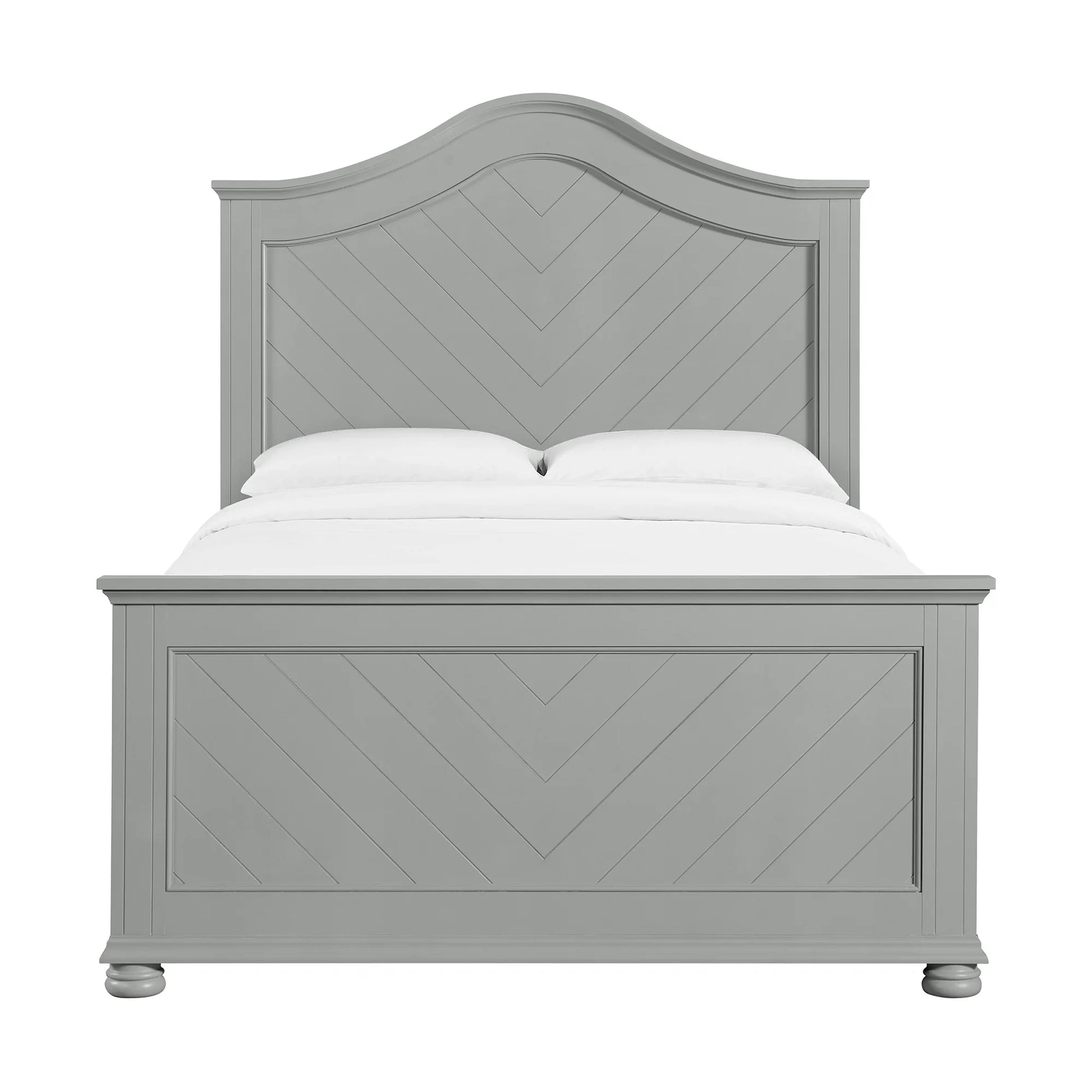 Upgrade your bedroom with the Kona Full Panel Bed featuring a stylish chevron pattern detail on the headboard and footboard. The curved headboard design adds a touch of elegance to your room while the bun feet provide stability and style. With four slats and four slat supports, this bed offers durable support for a restful night's sleep. Add a touch of traditional flair to your bedroom with the Kona bedroom collection.