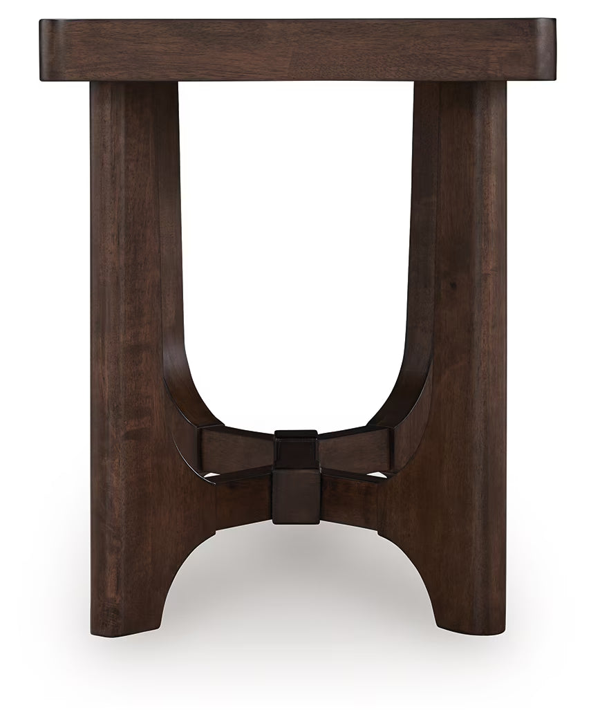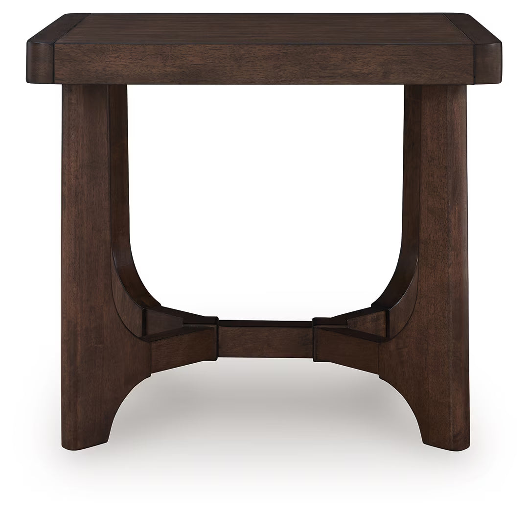 Master the art of casual contemporary design with this end table. Its softly rounded wood frame top pairs perfectly with an eye-catching double wishbone base and a rich brown finish for a decidedly here and now vibe. Talk about the ideal spot for drinks, decor and more.