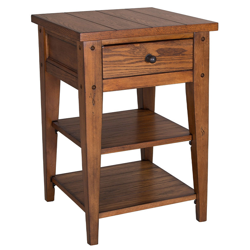 Accent your space with the casual country style Lake House chair side table. Crafted of poplar solids and oak veneers, this piece features an oak finish, appealing planked top, two open planked shelves, simplistic wood and peg accents, one drawer accented by antiqued brass knob hardware, anchored by a tapered leg design. The golden oak finish allows for a universal appeal.