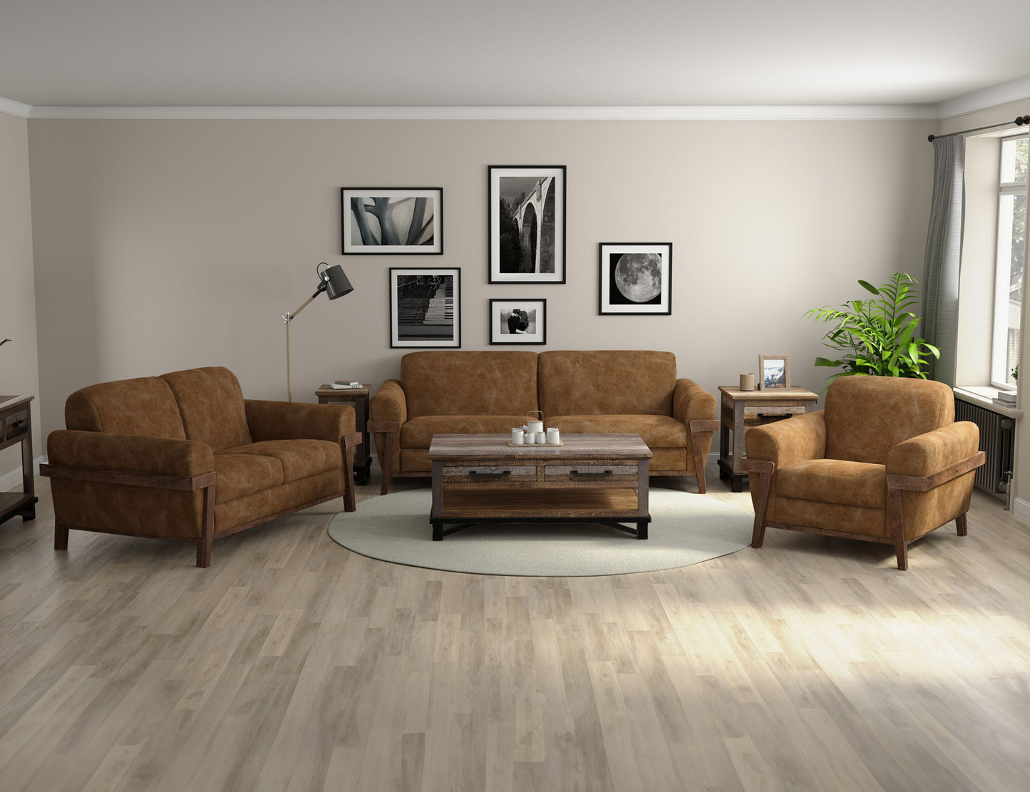 Introducing our captivating Loft Brown Collection, where traditional design seamlessly merges with mid-century modern details in this stunning transitional piece. With its distinctive exposed pine wooden legs and frame, retro-inspired rolled arms, and meticulous craftsmanship, this collection features solid wood and 15mm-thick, 5-layer plywood construction, ensuring both the strength and durability of the frames.