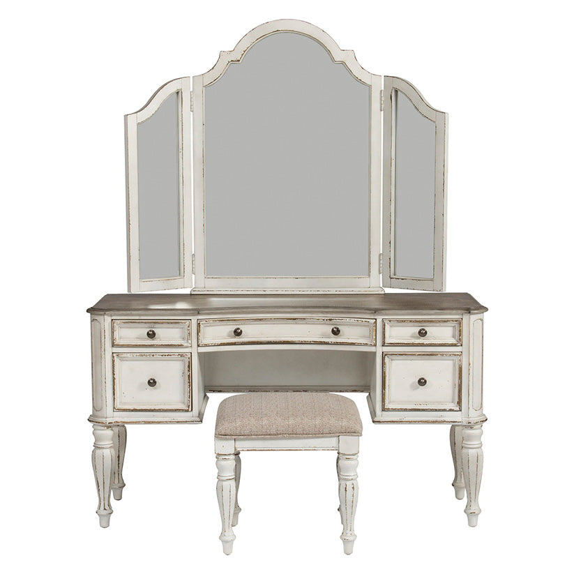Start your mornings off by utilizing this charming 3-piece vanity set. Sit in comfort with the vanity stool upholstered in a beautiful ivory tweed chenille. The weathered brown whitewash top paired with the antique white finish creates a truly unique look. You will be sure to see every angle with the trifold mirror. This unique piece is the perfect finish touch to any space.