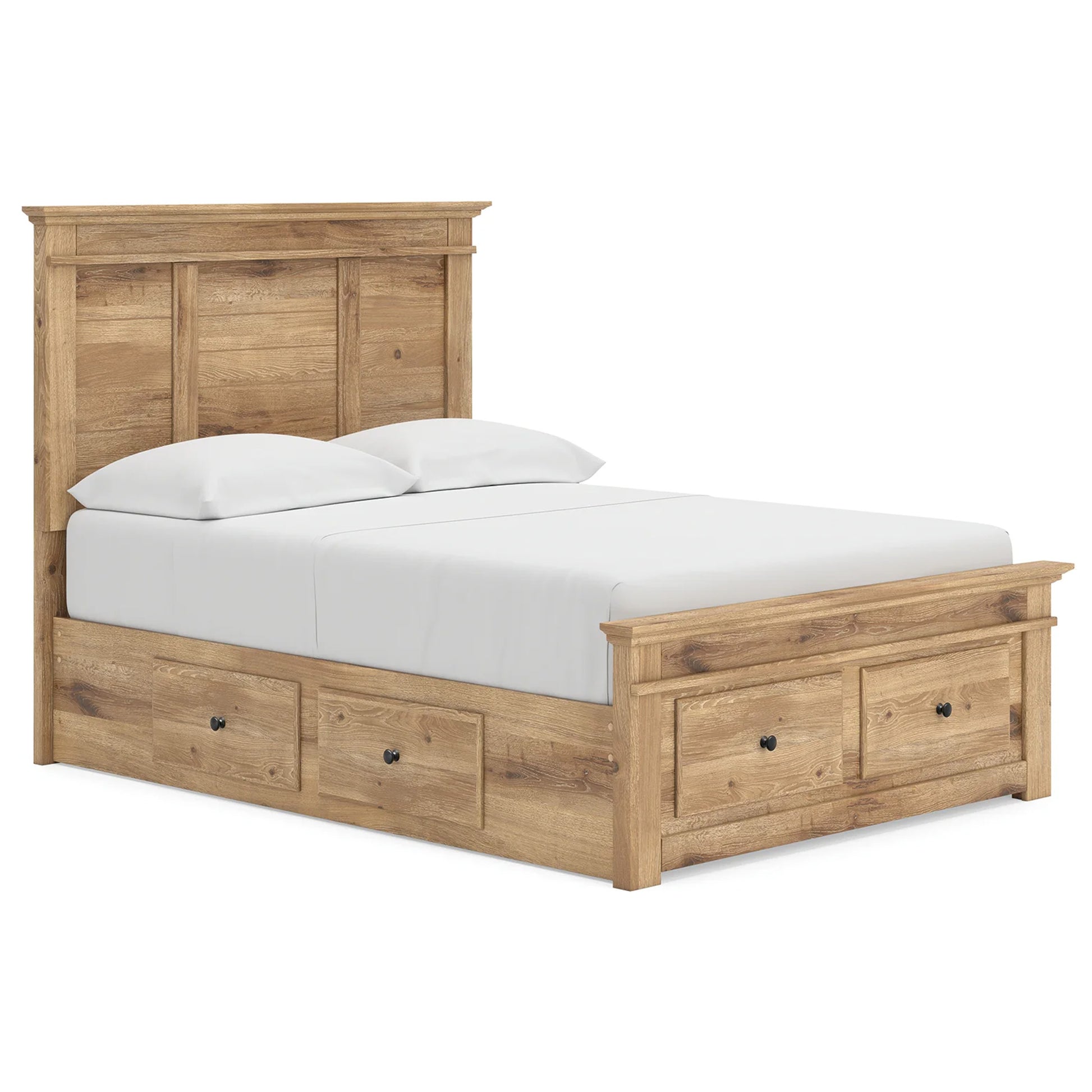 Looking to create a bedroom that feels airy and beautifully put together? This casually comfy full panel storage bed is your perfect solution. Its clean lines, replicated oak grain and on-trend natural finish exude a charming cottage-inspired feel that brightens your restful retreat. Spacious drawers with dark bronze-tone knobs stow away clothes and more. Now there’s a fresh take on country living we can get behind.