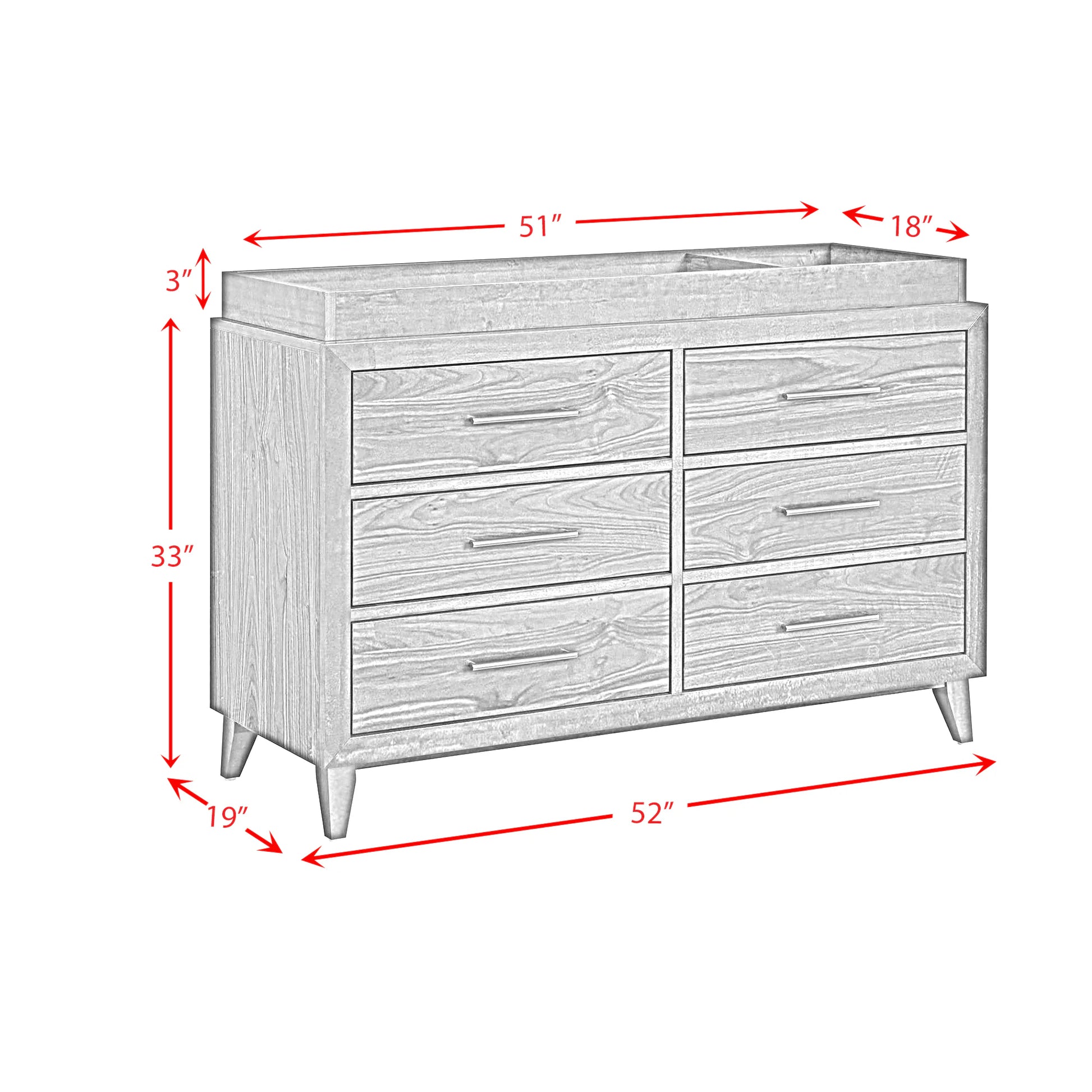 Decorate your nursery with the mid-century modern style of the Malia 6-Drawer Dresser and Topper. Built with solid poplar wood with a quality walnut veneer, this dresser doubles in function as a changing table. Six spacious drawers provide ample space for storing your baby essentials, while English dovetailing and smooth ball bearing drawer glides mark skillful craftsmanship. Sleek, brass colored metal handles and distinctly tapered feet add charming detail, while an included anti-tip kit enhances safety. For a durable, versatile, and stylish addition to your child nursery, the Malia 6-Drawer Dresser and Topper delivers.