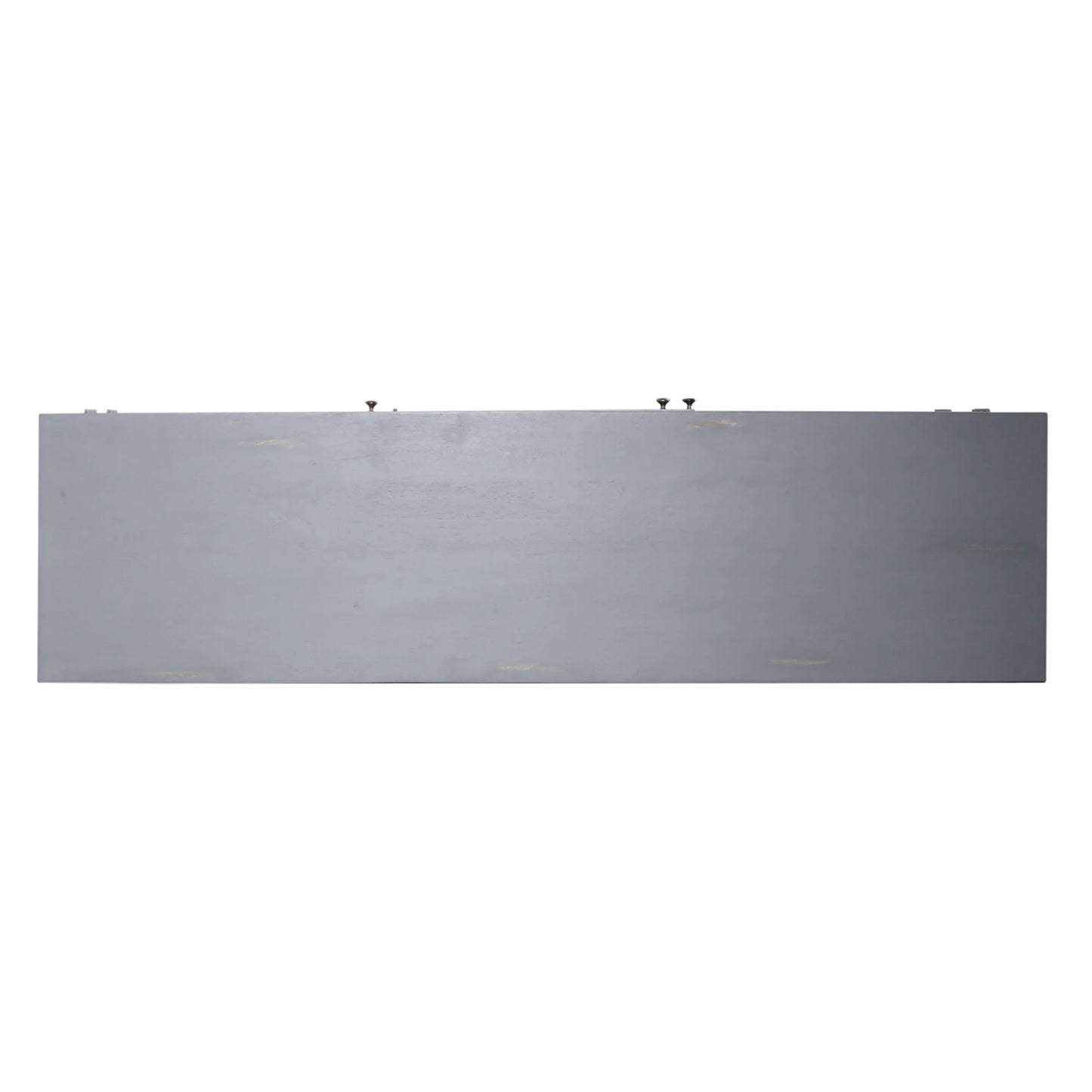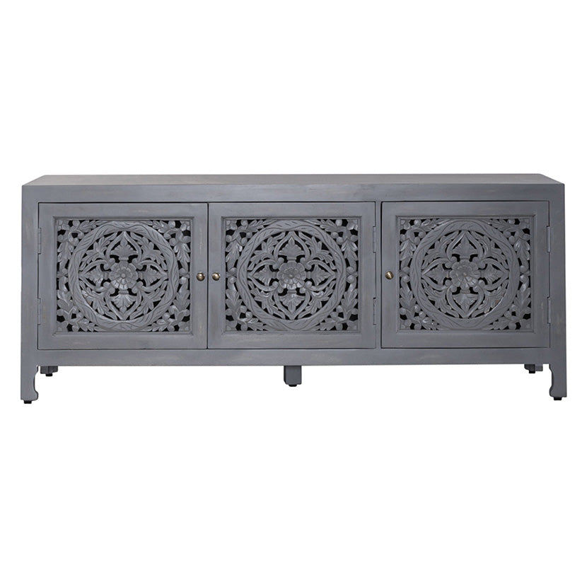 Marisol 65” accent TV console gives you that Boho chic feel that is so popular today. Boho is a mix of colors, styles, and materials to create a carefree causal comfortable space. Crafted of solid mango with a soft wash grey finish. Features three artisan hand craved doors in a floral pattern, one fixed shelf behind each door, shaped block legs with antique brass knob hardware. Perfect as a TV console.
