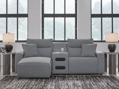 - Includes 3 modular pieces: left-arm facing power reclining back chaise, console with audio system and right-arm facing power recliner