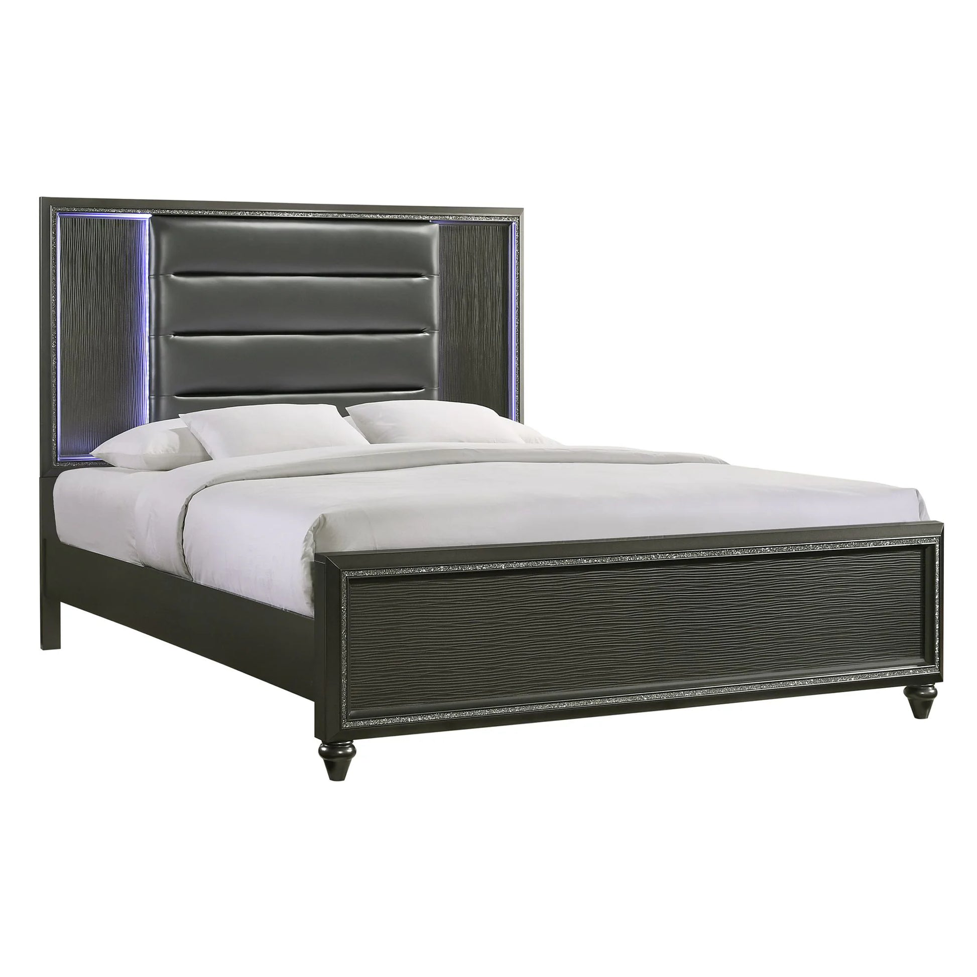 Moonstone Queen Panel Bed in Black is a one of a kind addition for your bedroom. Upholstered in polyethylene and consisting of textural design throughout. Crafted of solid woods and veneers. Finished in a transitional, mountain gray . Features mood lightening in headboard to create a beautiful ambiance. Perfect for contemporary or modern bedroom aesthetics.