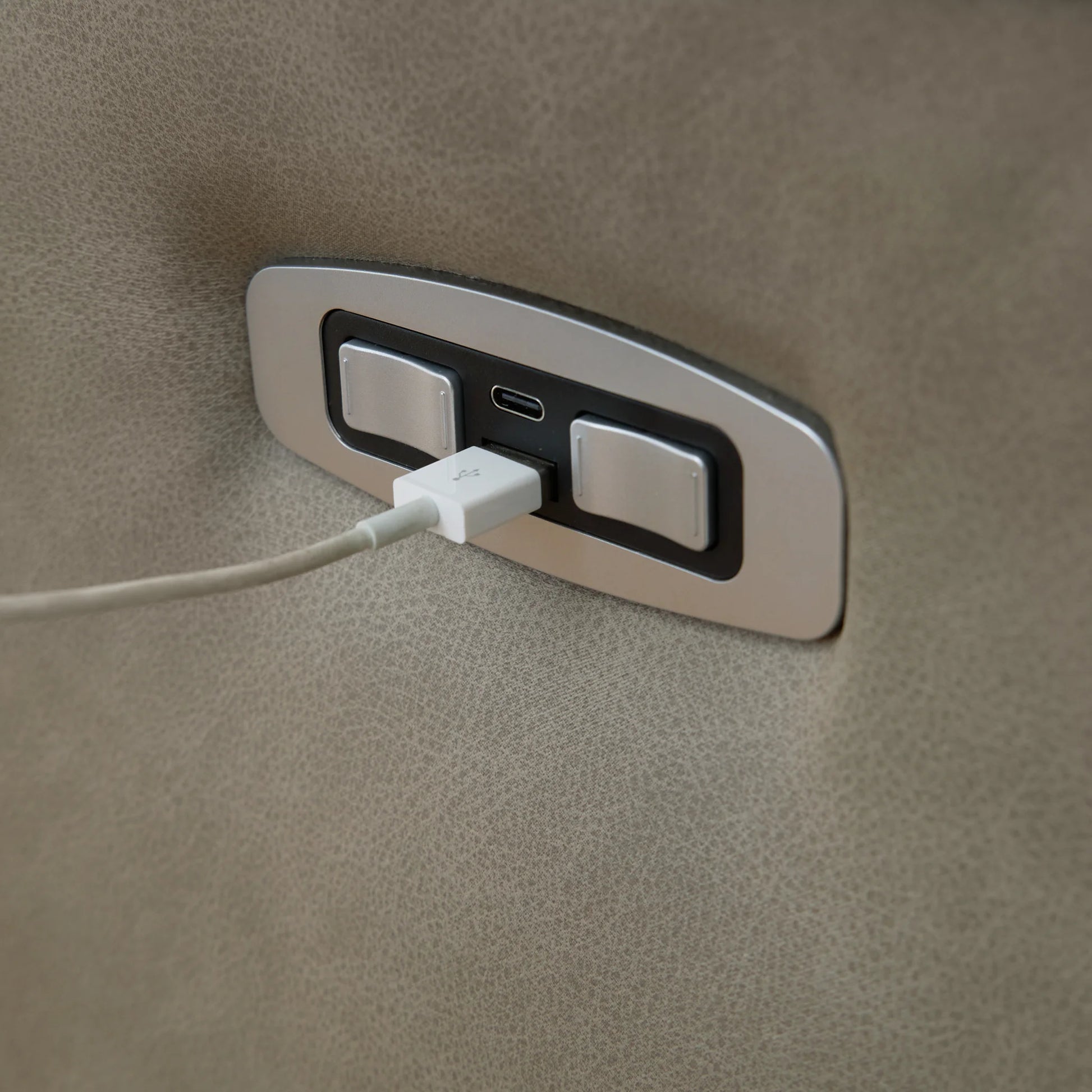 Experience ultimate comfort with this power reclining sectional. Generously cushioned with plush bustle back styling and pillow top track arms, it's wrapped in a richly neutral upholstery that’s oh-so soft. Jumbo stitching gives the sectional added definition. The one-touch power control and USB charging take the pleasure of reclining to a higher level, while a console with storage and dual cup holders marries function with great form.