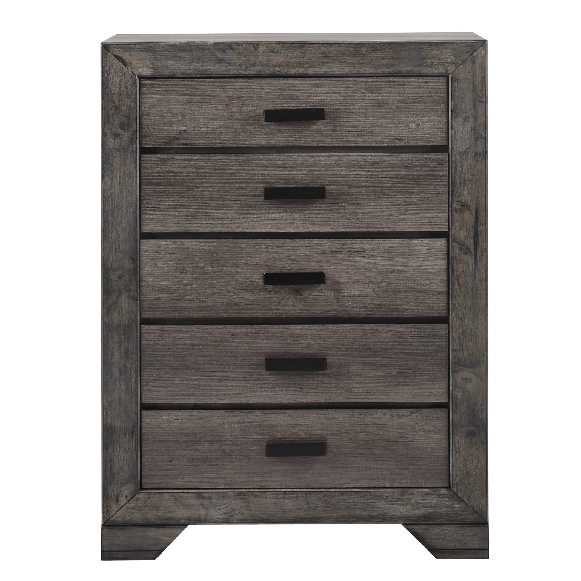 The Nathan 5-Drawer Chest is what rustic farmhouse dreams are made of! This vertical chest comes with five, spacious drawer; perfect for keeping all of your belongings neatly stored away. The top drawer is felt-lined and is a great spot to keep your more delicate items. The bottom drawer features a dust proofing layer to help protect your belongings. The weathered, gray oak finish pairs beautifully with the rustic metal drawer pulls. Sleek, clean lines and bracket feet complete the look of this rustic, chest of drawers.