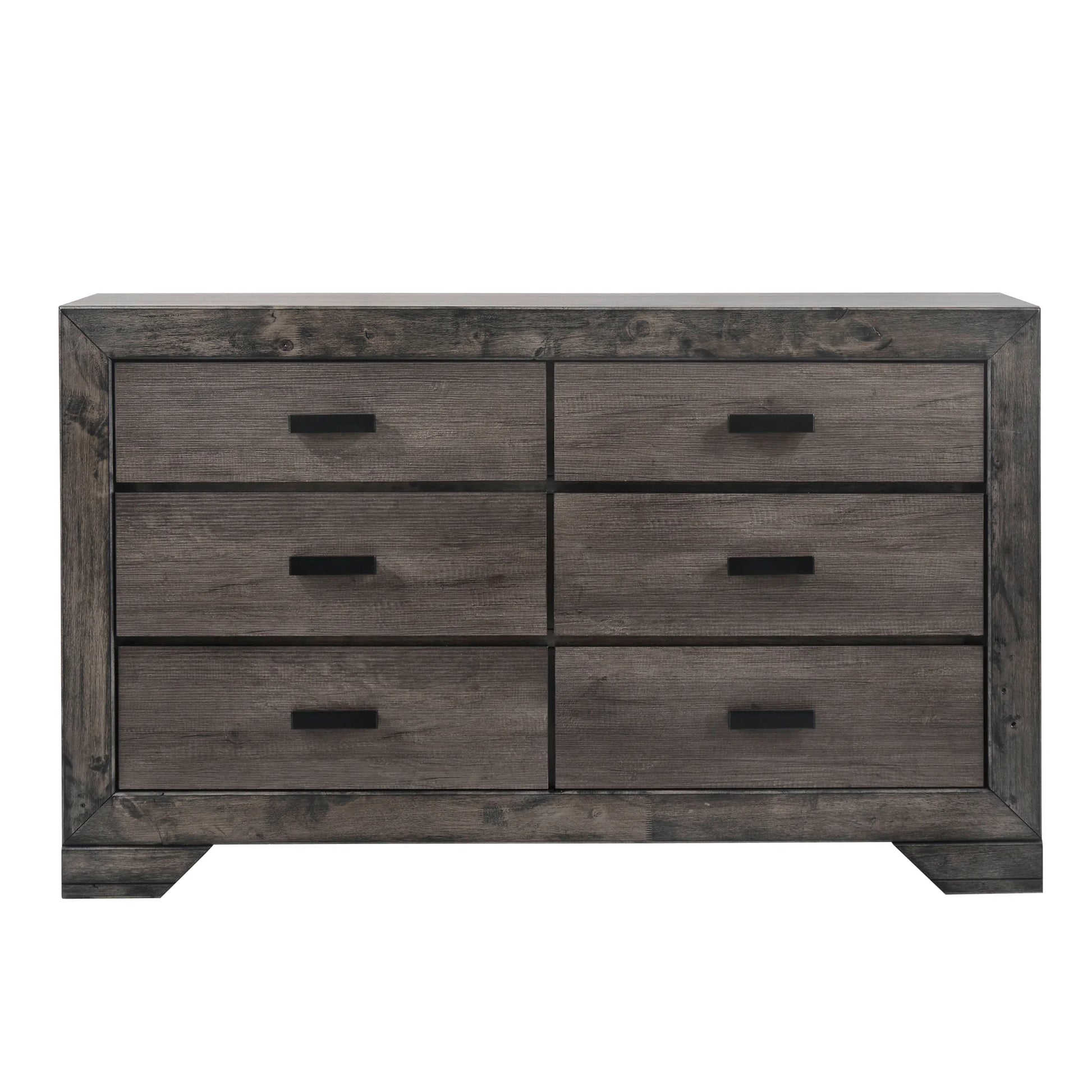 The Nathan 6-Drawer Dresser is what rustic farmhouse dreams are made of! This dresser comes with six, spacious drawers; perfect for keeping all of your belongings neatly stored away. Store away your more delicate items in the felt-lined top drawer to help keep your items looking new. The bottom drawers feature a dust proofing layer, also to help protect your items and keep them looking like new. The dark, metal hardware pairs beautifully with the weathered gray oak finish. Sleek lines and bracket feet complete the look of this rustic design, that will become a staple in your home for years to come.