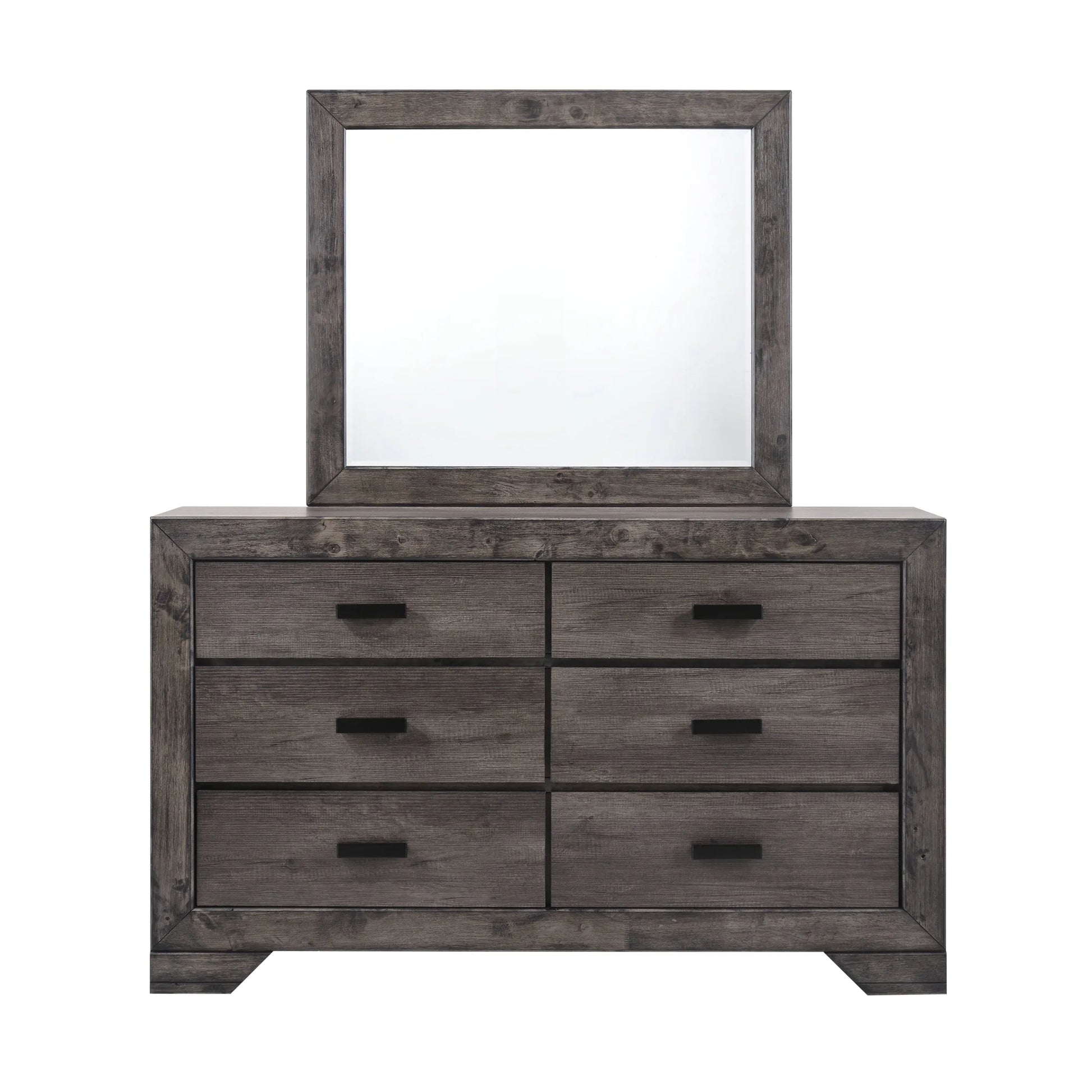 The Nathan 6-Drawer Dresser with Mirror is what rustic farmhouse dreams are made of! This dresser comes with six, spacious drawers; perfect for keeping all of your belongings neatly stored away. Store away your more delicate items in the felt-lined top drawer to help keep your items looking new. The bottom drawers feature a dust proofing layer, also to help protect your items and keep them looking like new. The dark, metal hardware pairs beautifully with the weathered gray oak finish. Sleek lines and bracket feet complete the look of this rustic design, that will become a staple in your home for years to come.