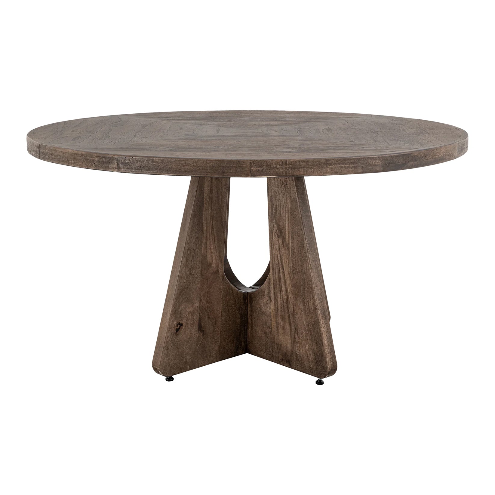 Natural Teca, Table 55". The Natural Teca collection features a beautifully crafted dining table that highlights the beauty of teak wood. It features a round top crafted from mango and teak veneer, finished in a rich brown that highlights the natural wood grain. The smooth, polished surface exudes warmth. The deep brown lacquer mango wood base adds a modern balance. The Natural Teca round table set combines style and functionality, making it a versatile addition to any interior design.