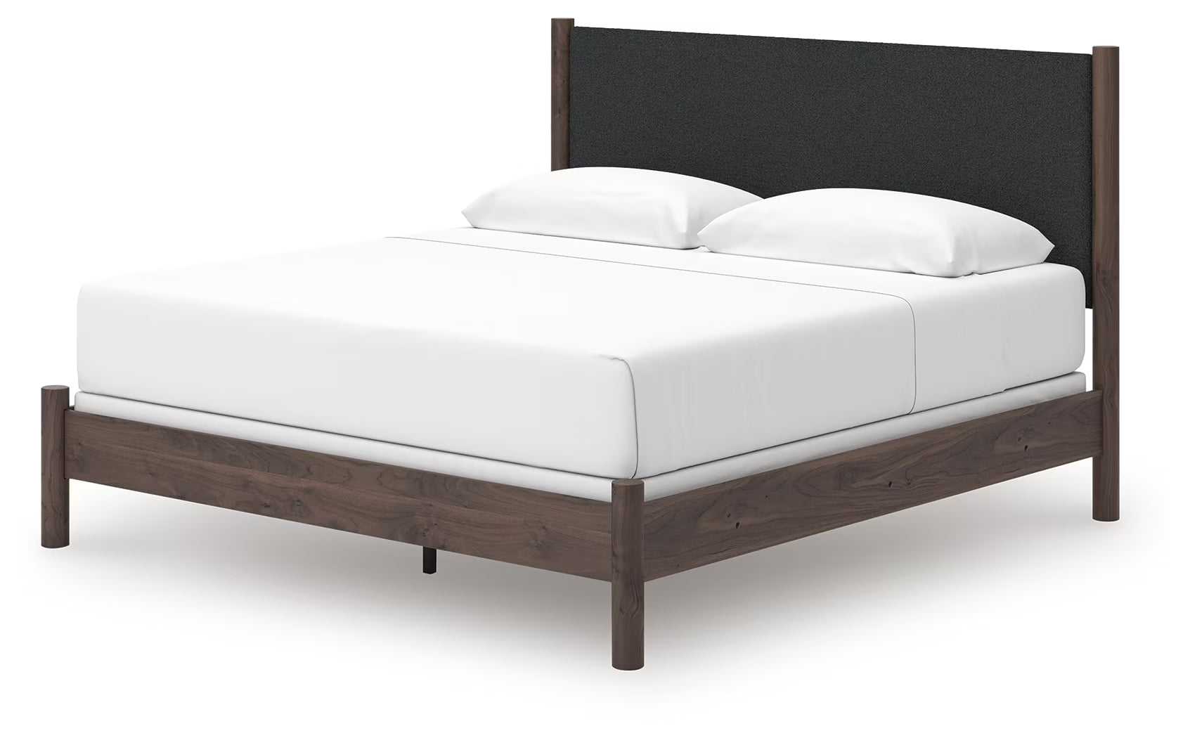 Crafted with both form and function in mind, this queen upholstered panel bed brings a dash of retro-cool character to your modern boho aesthetic. Its textured black headboard fabric adds a trend-right touch to the classic silhouette. Warmly welcoming with a rich brown finish, the bed pairs well with muted hues, earth tones and other neutrals alike. What a refined take on easygoing style.