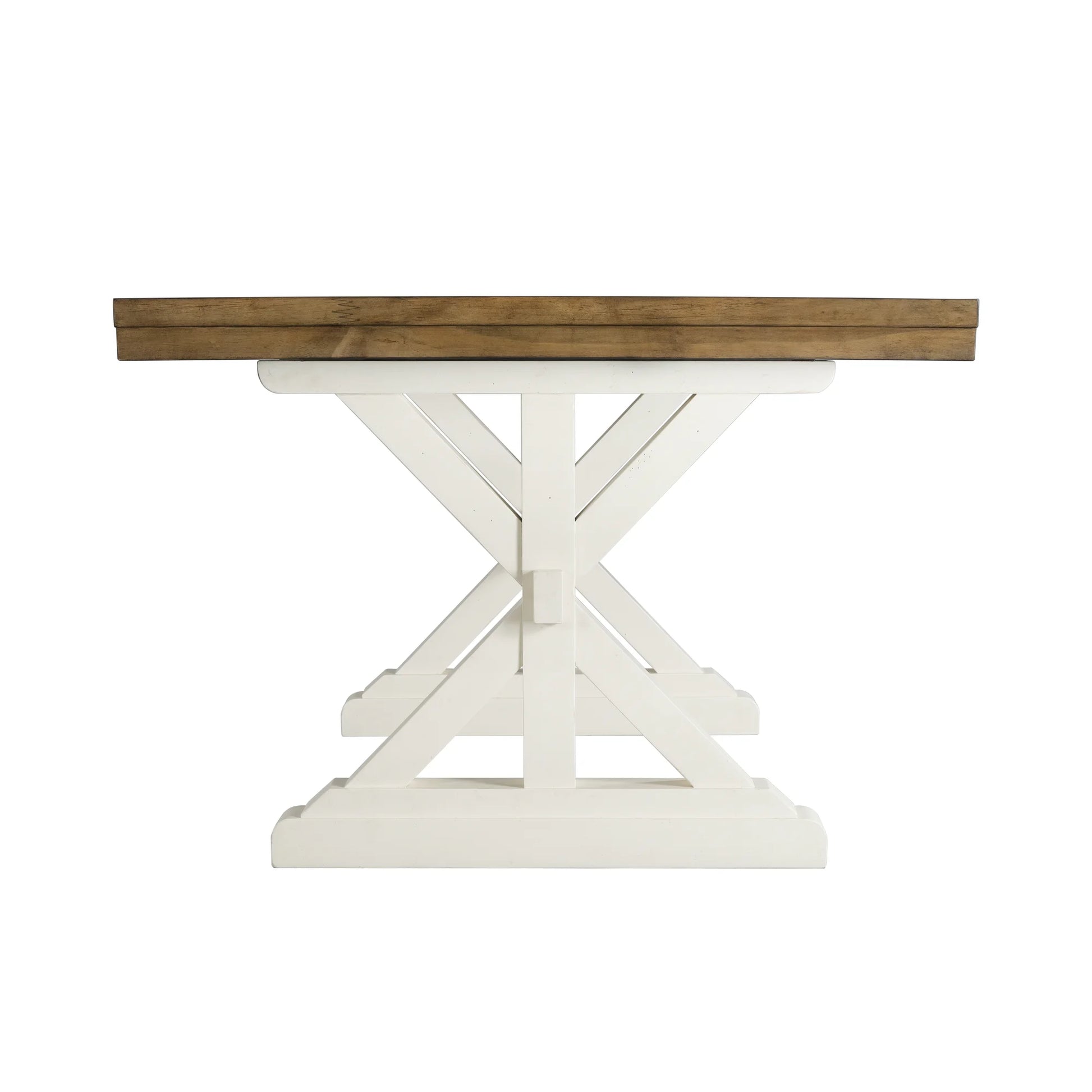 The Park Creek Standard Height Dining Table will look stunning in your home! This rectangular table features a trestle base, finished in a cottage white. If you are in need in more space around the table, easily add the 18" removable leaf to accommodate for extra people. The table top features a cool, unexpected design that instantly adds style to this farmhouse table. Add this dining table to your home today for a look that will never go out of style.