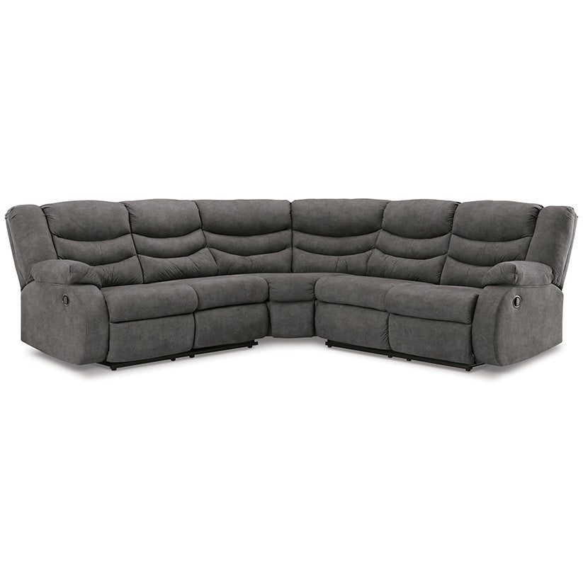 Affordable luxury made easy. An essential for living room lounging, this sectional is a star in social spaces. Its sleek slate gray faux leather is well-suited for mixing and matching with your existing pieces. Pull tab reclining keeps you and your companions covered when it comes to comfort. And this functional piece is equally as fashionable, with design details like a channel-stitched back incorporating subtle visual interest.