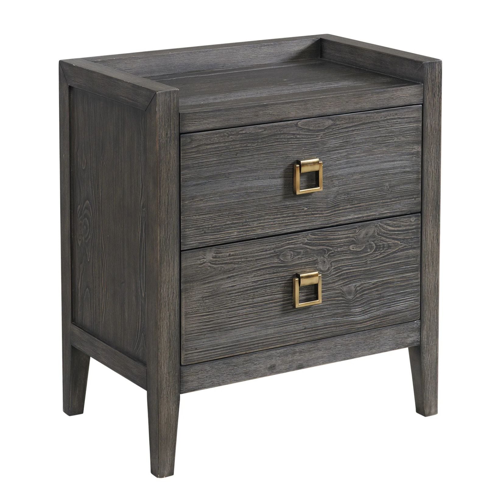 Spruce Veneer and hardwood solids. Contemporary style with heavily wire brushed dark spruce finish with silver undertones. The angular “ring pull” style hardware has an antique gold finish.