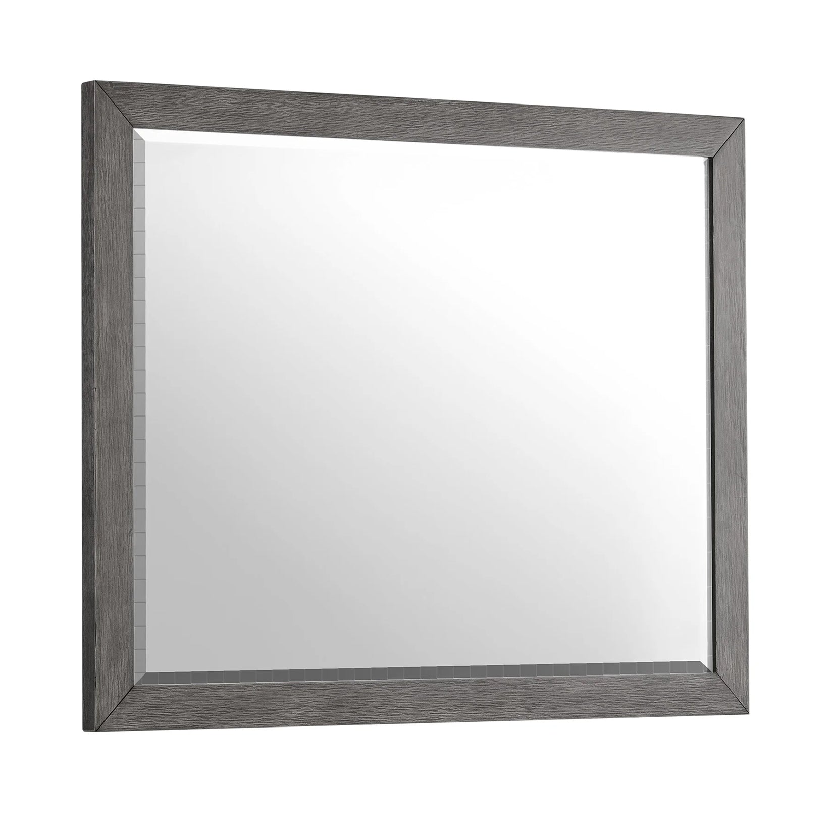 Spruce Veneer and hardwood solids. Contemporary style with heavily wire brushed dark spruce finish with silver undertones. The angular “ring pull” style hardware has an antique gold finish.