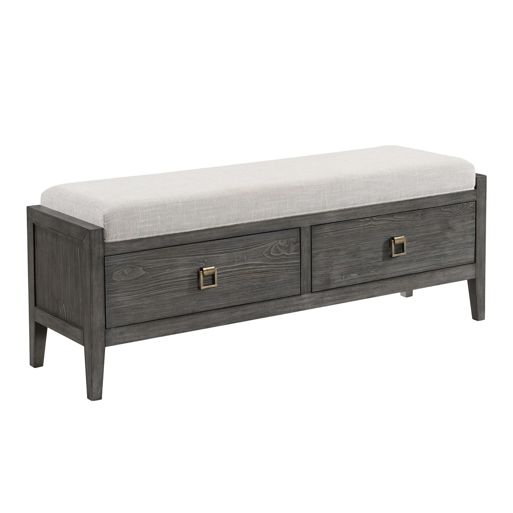Spruce Veneer and hardwood solids. Contemporary style with heavily wire brushed dark spruce finish with silver undertones. The angular “ring pull” style hardware has an antique gold finish.