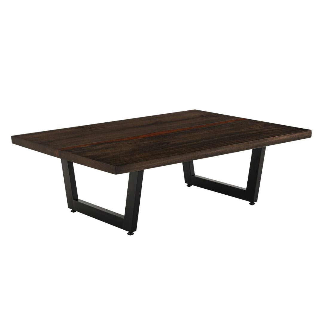 Cocktail Table DeLux. The Raramuri occasional table set is a high-quality addition to any living room, crafted from sustainable mango wood. Each table features a unique natural live-edge top. The tops of both the cocktail and sofa tables are infused with epoxy resin and copper mineral flakes, enhancing their durability and visual appeal. This occasional table set highlights the natural beauty and tonal variations of mango wood. The metal base offers a stable and long-lasting foundation, making these tables ideal for everyday use.