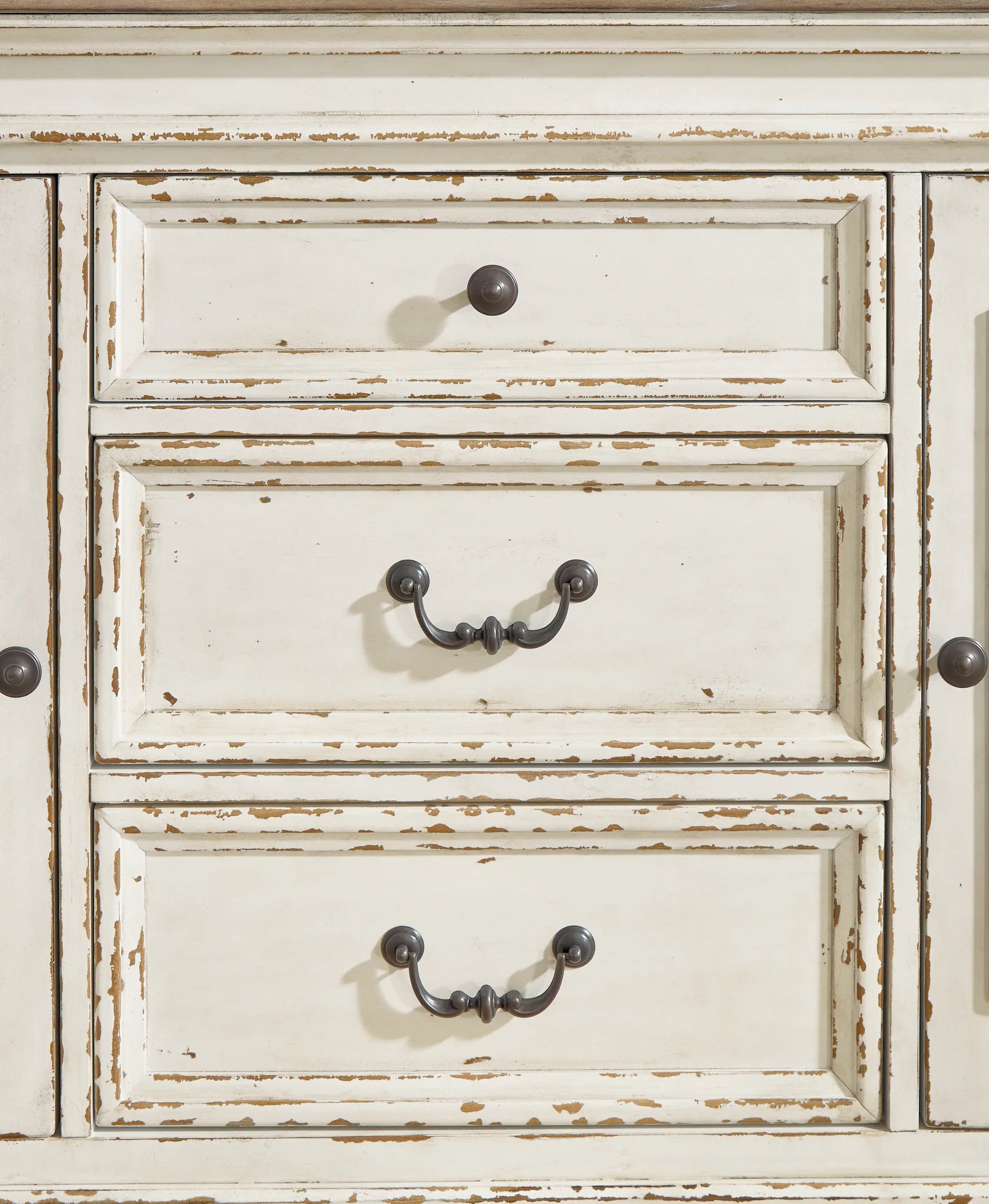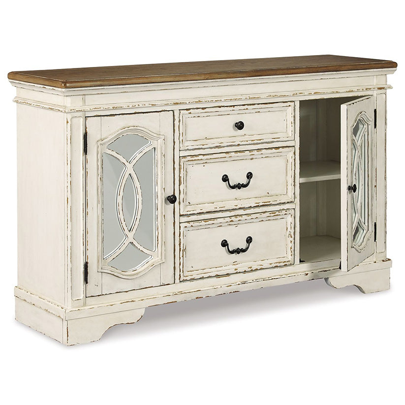 Serve up a French country-inspired feast for the eyes with this dining room server. Unique elements include cabinet storage beautified with decorative fretwork over mirrored glass and a doubly charming two-tone aesthetic pairing a chipped white with a distressed wood finished top.