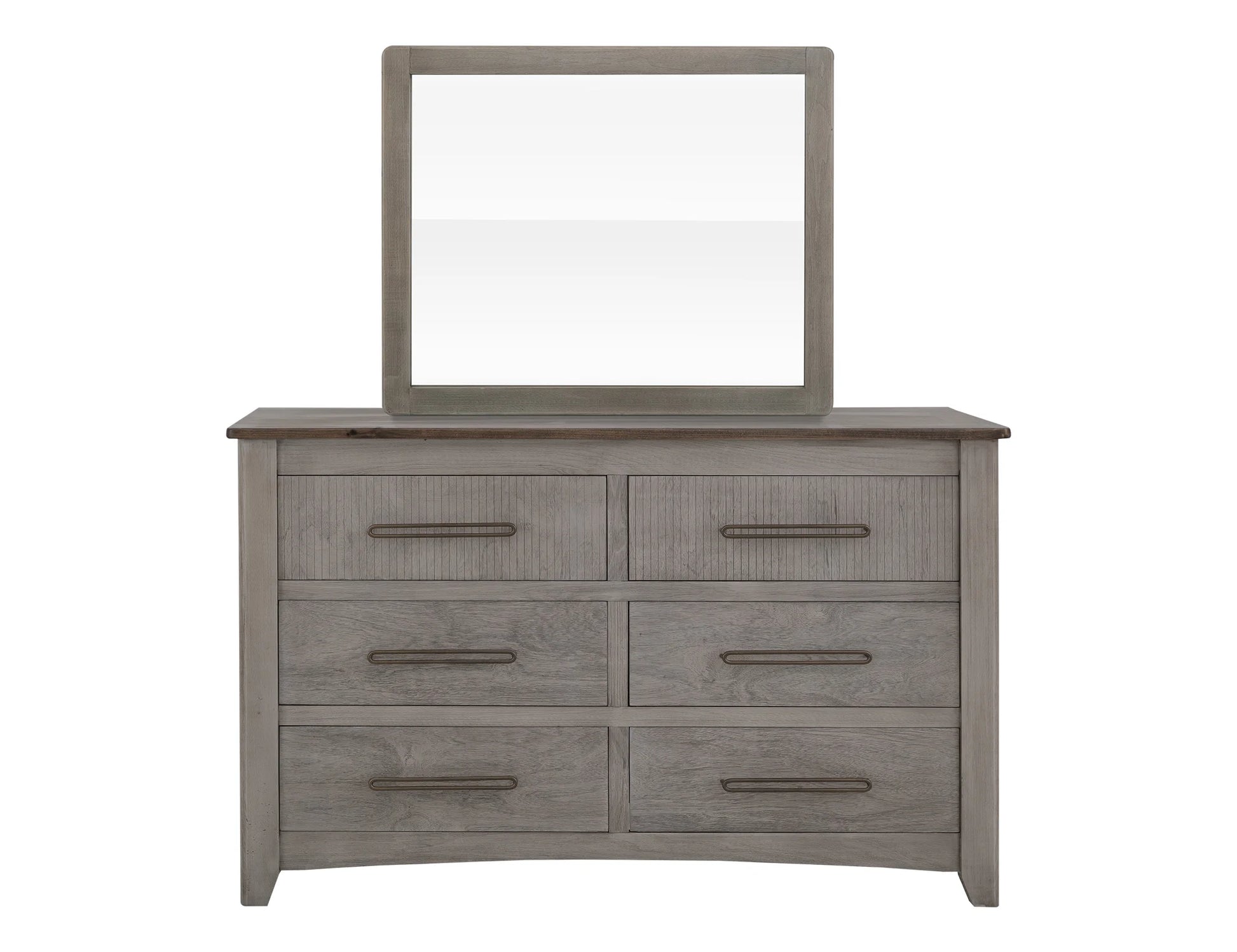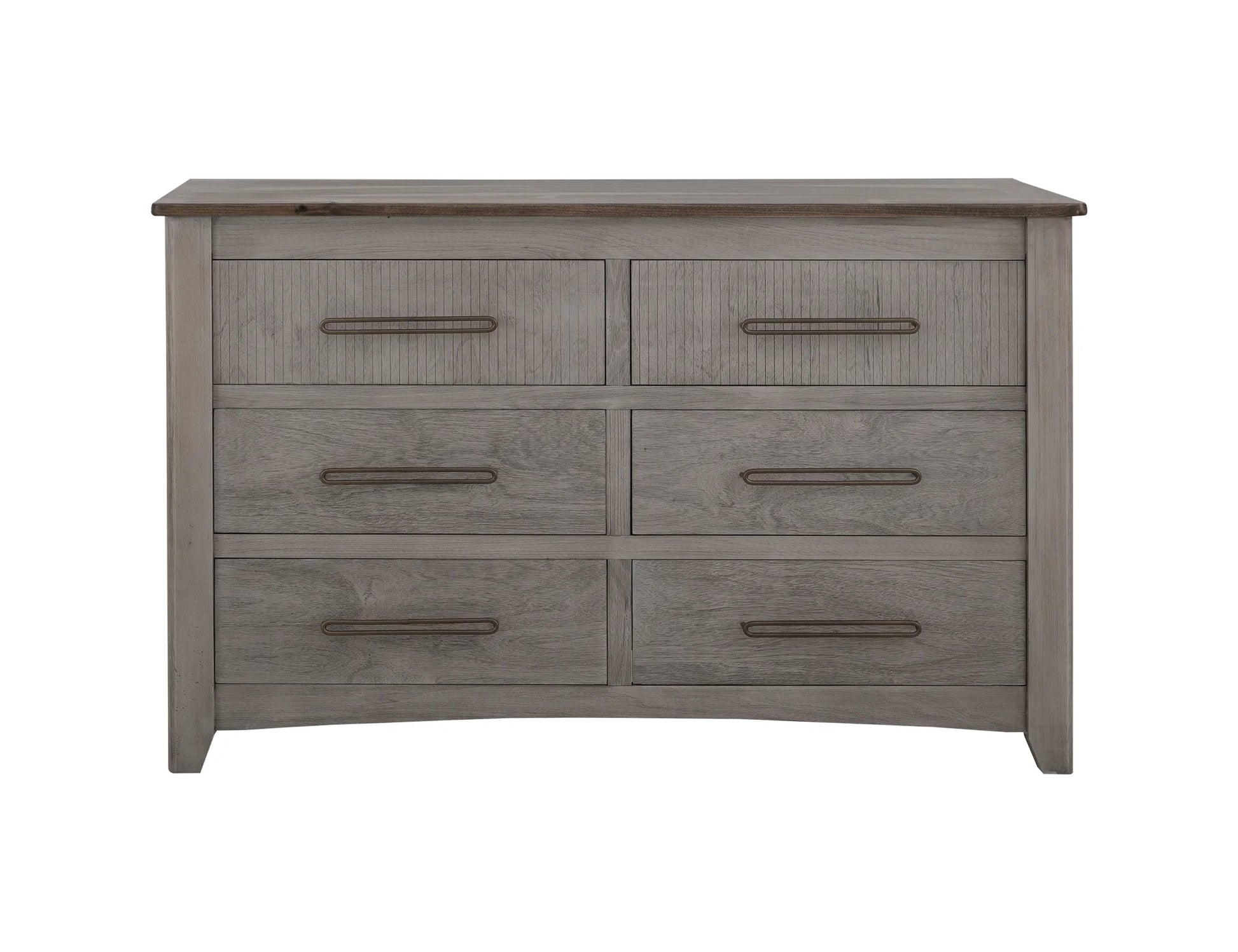 6 Drawer, Dresser. The Ridge dresser features six spacious drawers, offering plenty of storage for all your bedroom essentials. It features sleek metal handles that enhance its modern aesthetic. Made from Melina and poplar wood, this collection guarantees durability and timeless appeal. The elegant light gray finish and brown tops blend seamlessly with any décor style. Additionally, the channeled design adds a touch of sophistication and texture to the furniture.
