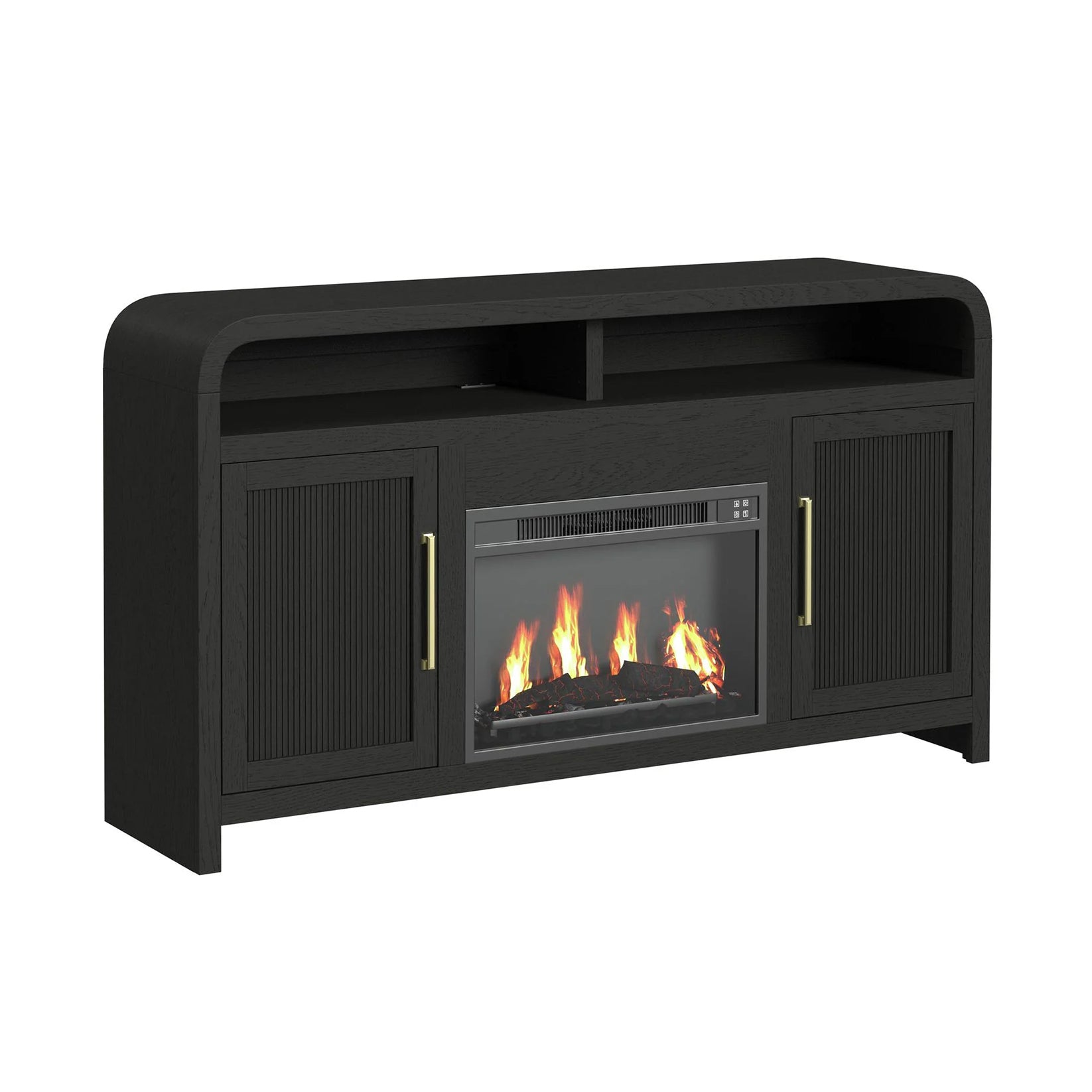 Accent your entertainment area with the refined style of the Ridgemont Complete Fireplace Cabinet in Black. This piece artfully blends geometric and organic shapes by showcasing a rectangular tabletop with gently rounded corners. The cabinet door fronts easily become a focal point with their intricately fluted detailing and sleek metal handles, while the open shelving effortlessly extends display space. For a practical, versatile, and charming addition to your entertainment area, the Ridgemont Complete Fireplace Cabinet in Black satisfies on all fronts.