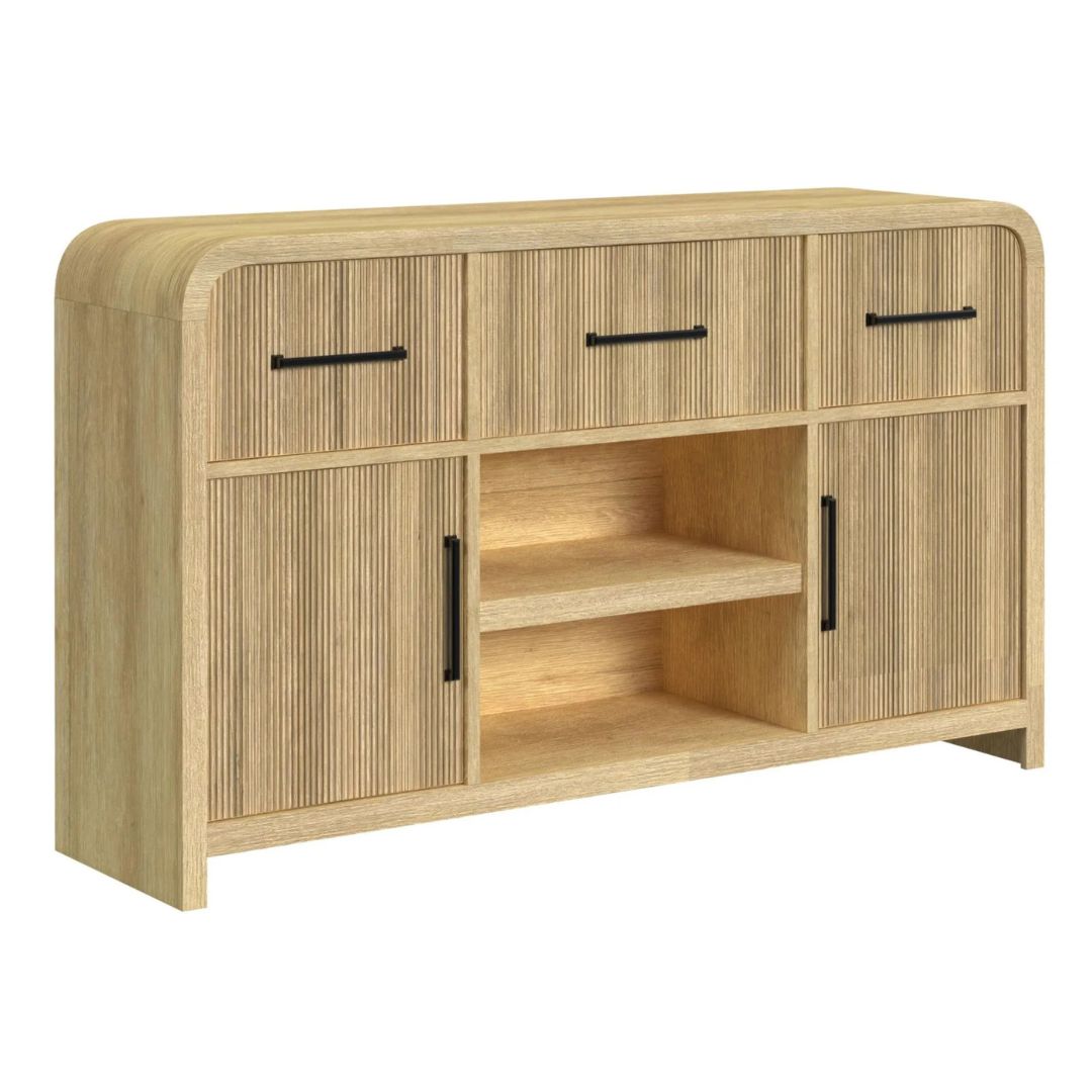 Introduce warmth and charm to your dining space with the beautifully crafted Ridgemont Server. The soft, natural tones and gracefully rounded edges create an inviting silhouette, while textured cabinet fronts add a touch of sincerity. Spacious drawers and shelves provide a perfectly organized cove for your cherished tableware, allowing you to blend practicality with style. Ideal for hosting memorable gatherings, this piece easily becomes the heart of your dining experience. Let the Ridgemont Server's timeless design inspire meals filled with warmth, laughter, and the cherished togetherness.