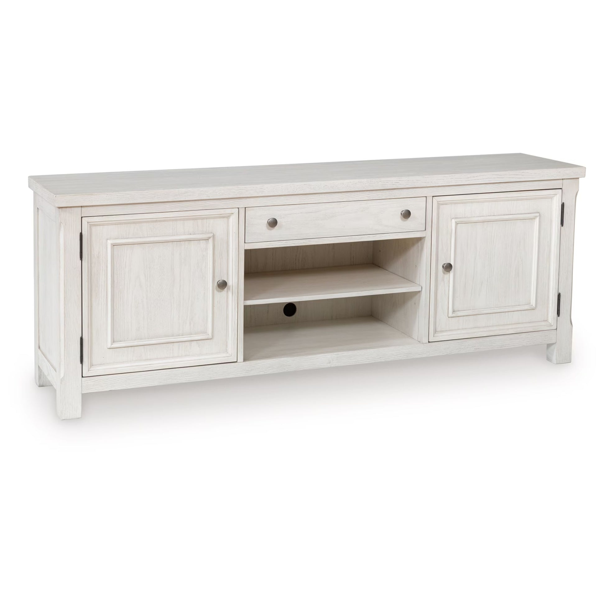 This TV stand is sure to impress when it’s time to relax after a tough day. With an antiqued white finish and wood grain texture, modern farmhouse-style design has never been so fashionable. Its cabinets and adjustable shelves are ideal for keeping all your equipment well organized and displaying your treasures. And that storage drawer is perfect for smaller accessories, bringing even more function to your entertainment space. All that’s missing is you.