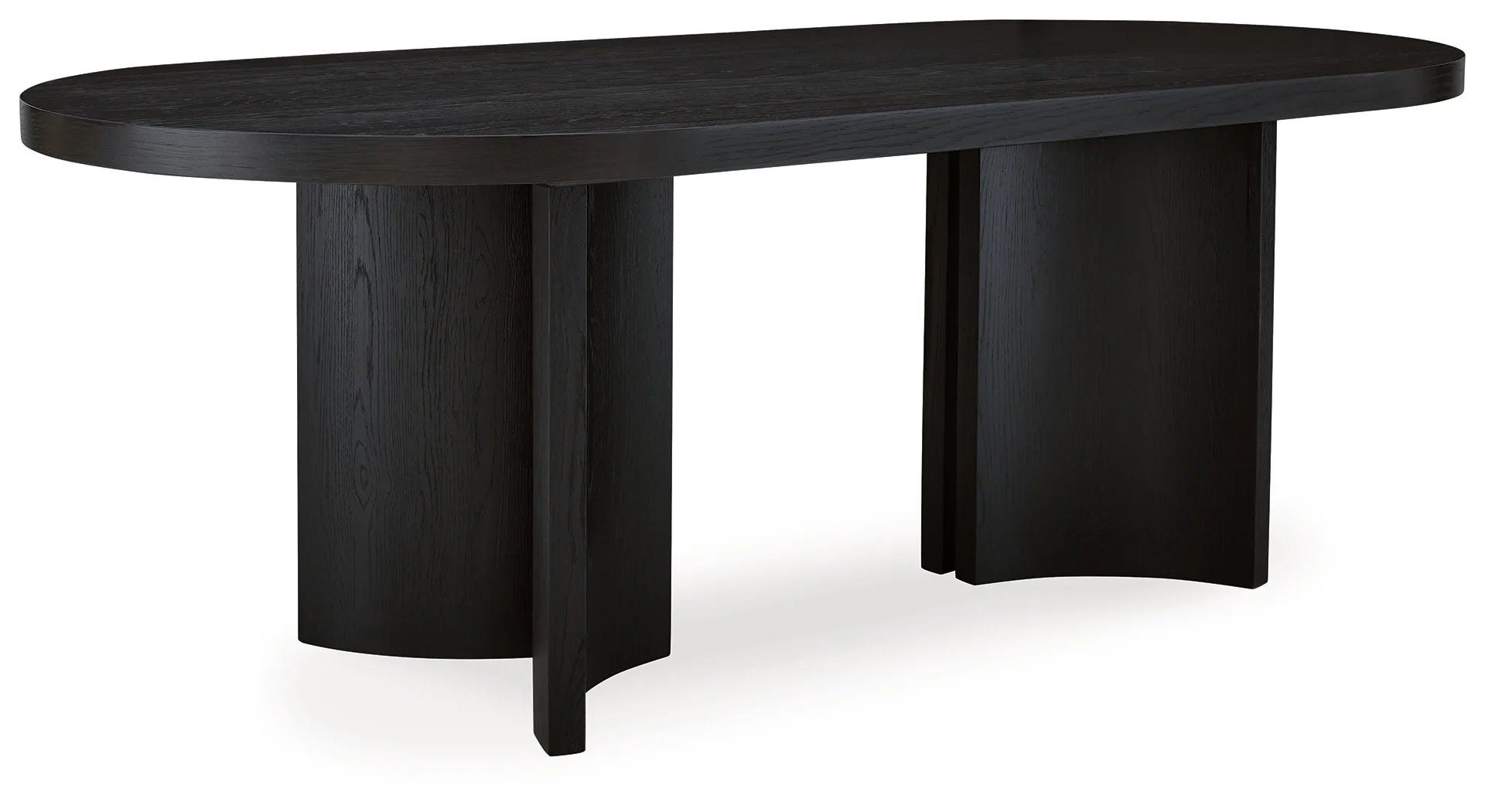 Contemporary lifestyle design. Made of hardwood solids and ash veneer. Rich layered black finish on textured wood grain surface. Collection is inspired by Art Deco designs with trend-right curved silhouettes. Table features an oval design and architectural inspired table pedestal. Can seat up to 8 people. Dining chair features an ultra sleek bent plywood back for contoured comfort and a cushion seat covered in a herringbone patterned gray fabric. It’s the contemporary statement piece you’ve been seeking to elevate late-night dinners and full-on family feasts.