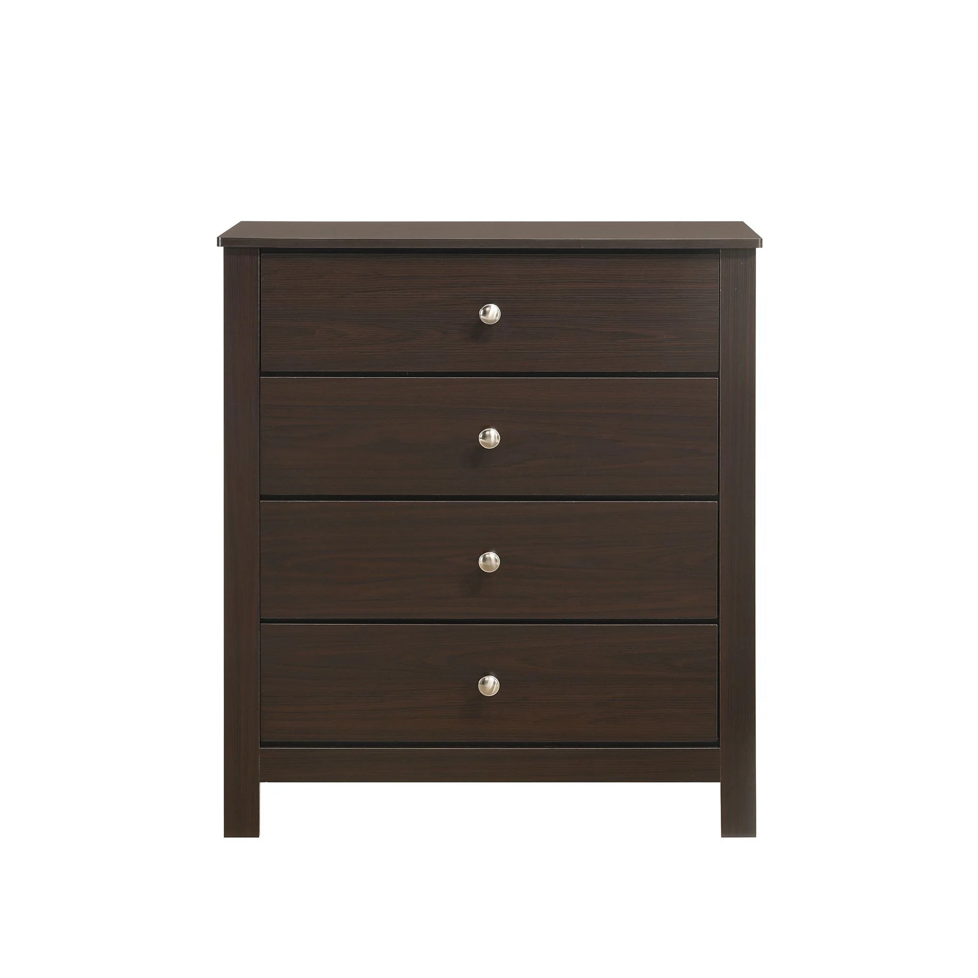 The Sami Chest offers the perfect blend of style and function for your child's room. The dark wood finish brings a sophisticated and elegant look, while the spacious drawers provide ample storage for clothing and essentials. Featuring smooth center metal glides, each drawer opens effortlessly for easy access. Designed with youth sizing, this set is ideal for kids' rooms, adding a touch of refinement. Stylish nickel knobs offer a modern accent, and the raised base with open feet gives the chest a contemporary feel, making it a practical and chic addition to any bedroom.