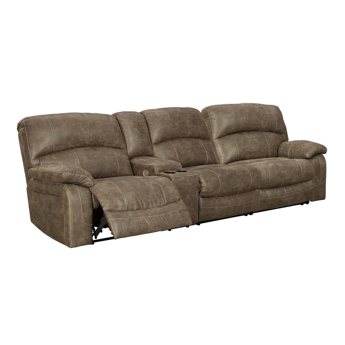 Sporting a driftwood brown faux leather with a gently distressed sense of charm, this sectional invites you to drift away in high style. Rest assured, the sectional’s leather alternative upholstery offers a warm, cozy feel, while clean-lined styling and jumbo stitching deliver the cool, contemporary look you love. Factor in power reclining motion, USB charging, convenient cup holders and a drop-down table, and you’ve got all the makings for the best seats in the house.