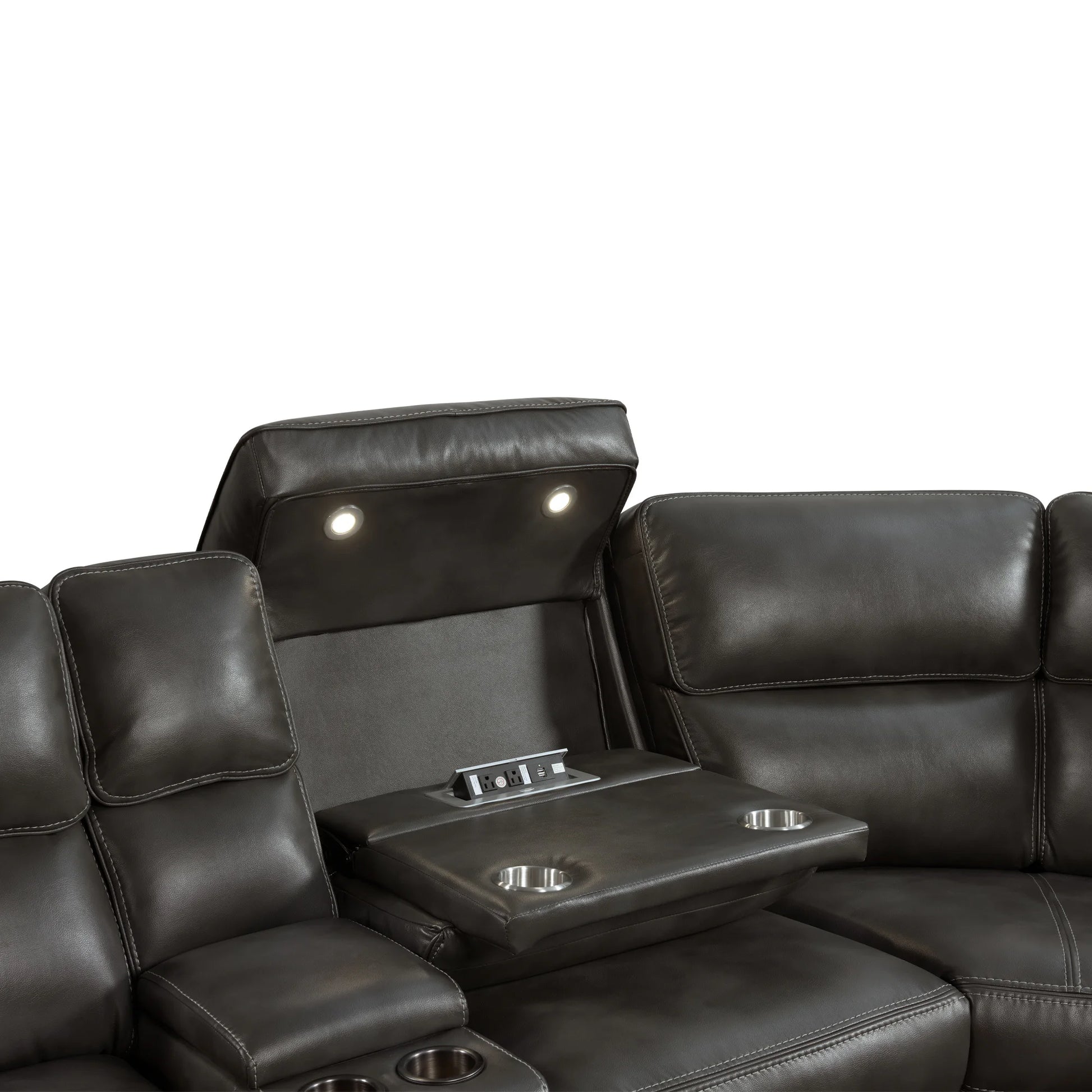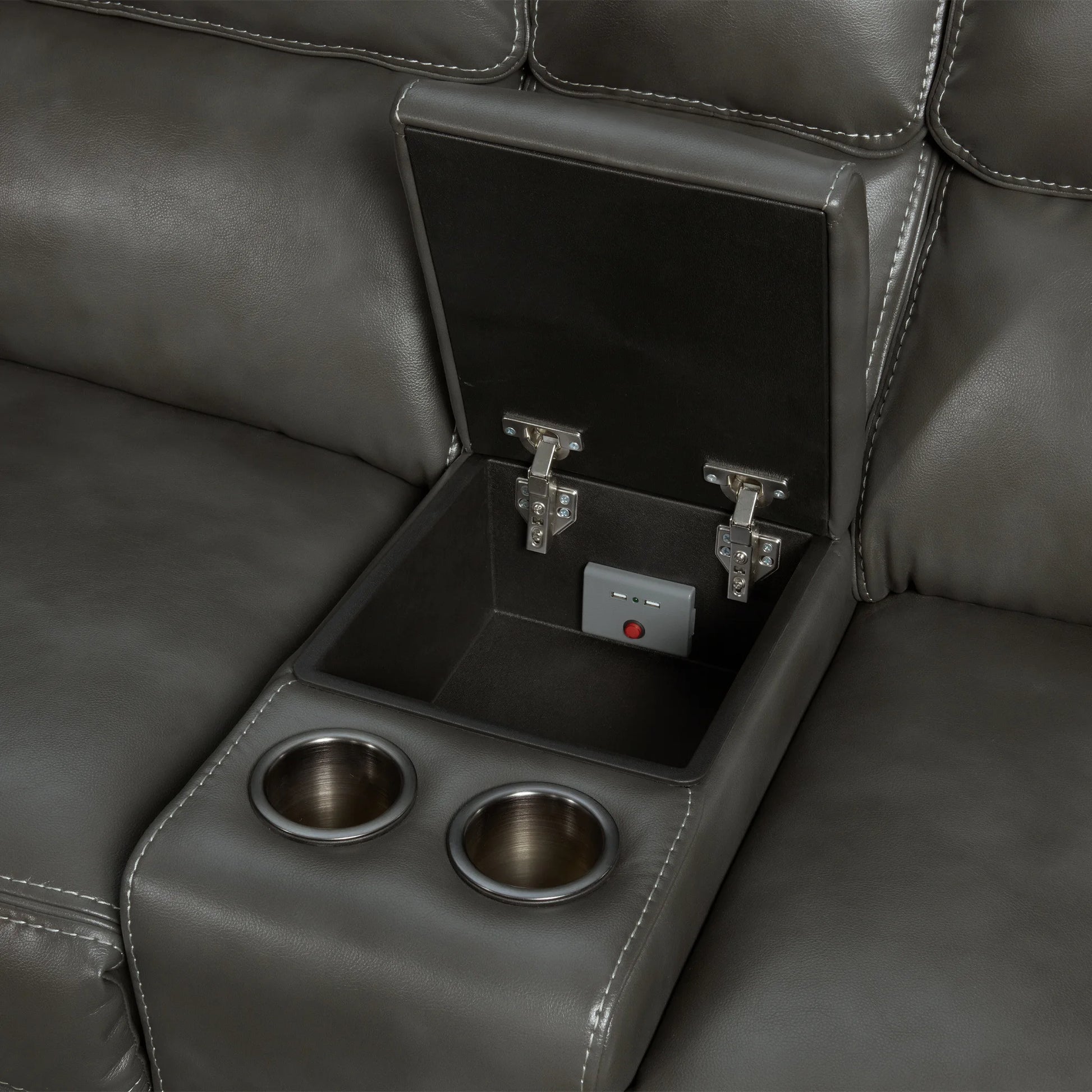 This is group is made for the modern family. The generous over padded track arm design, features a pub back and chaise seating. The groups comfort is enhanced by the power recline and power headrest. This group also features a few extra surprises! A drop-down table, two cup holders, floor lights, and charging stations. This group is featured in a polyurethane cover that has the look and feel of leather. Construction is engineered plywood frame with padding completely on outside arms and back and metal seat box construction.