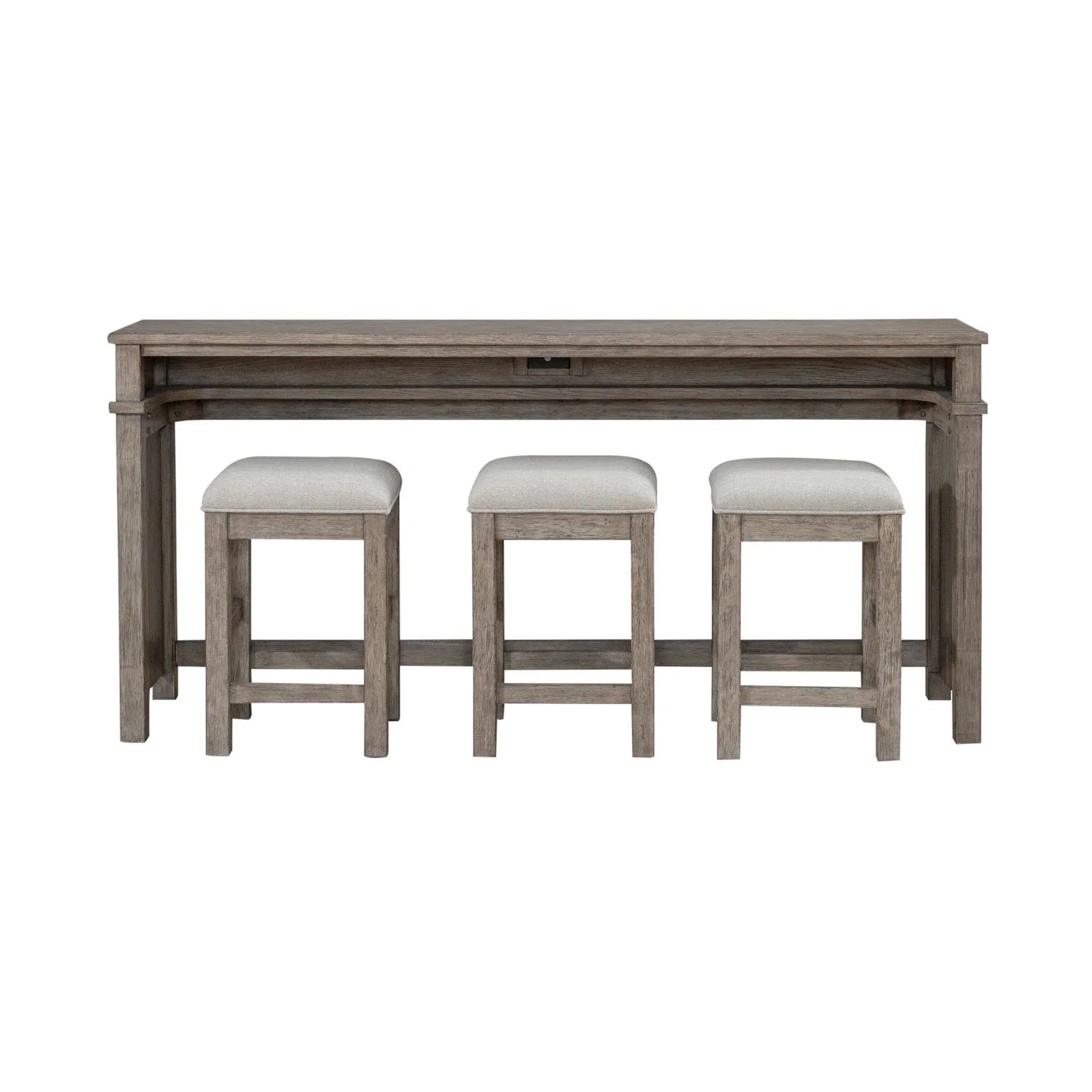 Infused with emotion, the Skyview Lodge 4 piece set is meticulously crafted using Rubberwood solids and White Oak veneers and features a Cobblestone finish. This set includes the console bar table and 3 upholstered console stools. Featuring X-reclaimed side panels, the console bar table exudes rustic charm and character, adding a touch of warmth to your decor. The unique detailing on the sides creates visual interest and elevates the overall aesthetic appeal of the table. Designed for convenience, this table comes equipped with small storage compartments beneath the top, offering ample space to store essentials such as coasters, napkins, or small items you want to keep within reach. But what sets this console bar table apart is its built-in charging station, complete with 2 AC outlets, 1 USB-A port, and 1 USB-C port. Say goodbye to tangled cords and dead batteries – now you can easily charge your devices while enjoying your time at the table. Perfect for placing behind the sofa, this table serves as more than just a decorative piece. It provides additional seating or workspace when needed, making it a versatile and practical addition to any room. The upholstered console stool features a padded seat upholstered in Textured Taupe fabric, providing a luxurious seating experience. the square block legs offer sturdy support while seamlessly flowing into a footrest, ensuring added comfort during extended seating sessions. Whether you're entertaining guests or simply relaxing at home, this stool is sure to enhance your seating experience. To protect your flooring from scratches and scuffs, nylon chair glides are added to the bottom of each leg. This thoughtful detail not only ensures the longevity of your stool but also gives you peace of mind knowing that your floors are protected. Elevate your living space with the Skyview Lodge 4 piece set, where functionality meets sophistication in perfect harmony.