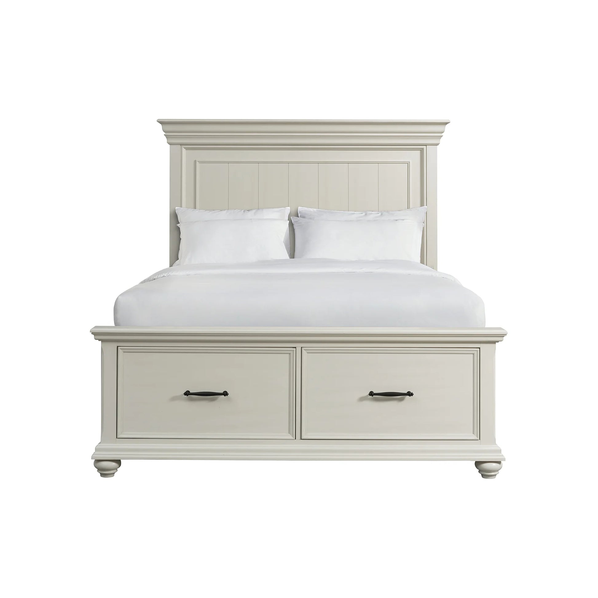 The Slater Queen Platform Storage Bed is going to look amazing in your home! This bed comes with two spacious storage drawers in the footboard, allowing you to easily store away extra blankets or linens. The headboard adds extra flair with its plank styling, making it a bed youll want to fall into every night! The off-white finish adds character and charm and will never go out of style. The dark metal drawer hardware pairs beautifully with the finish; while the bevel edges and bun feet complete the look.