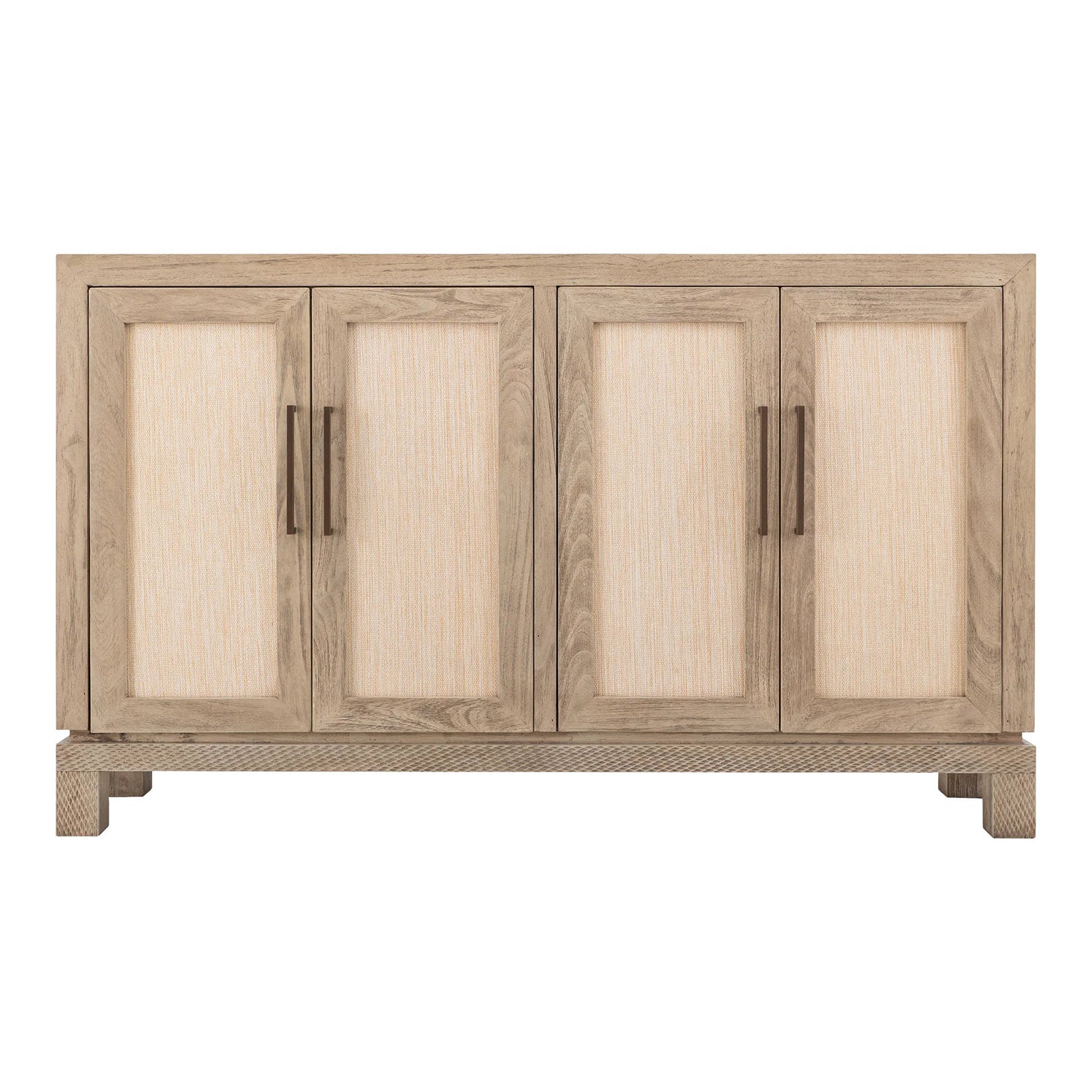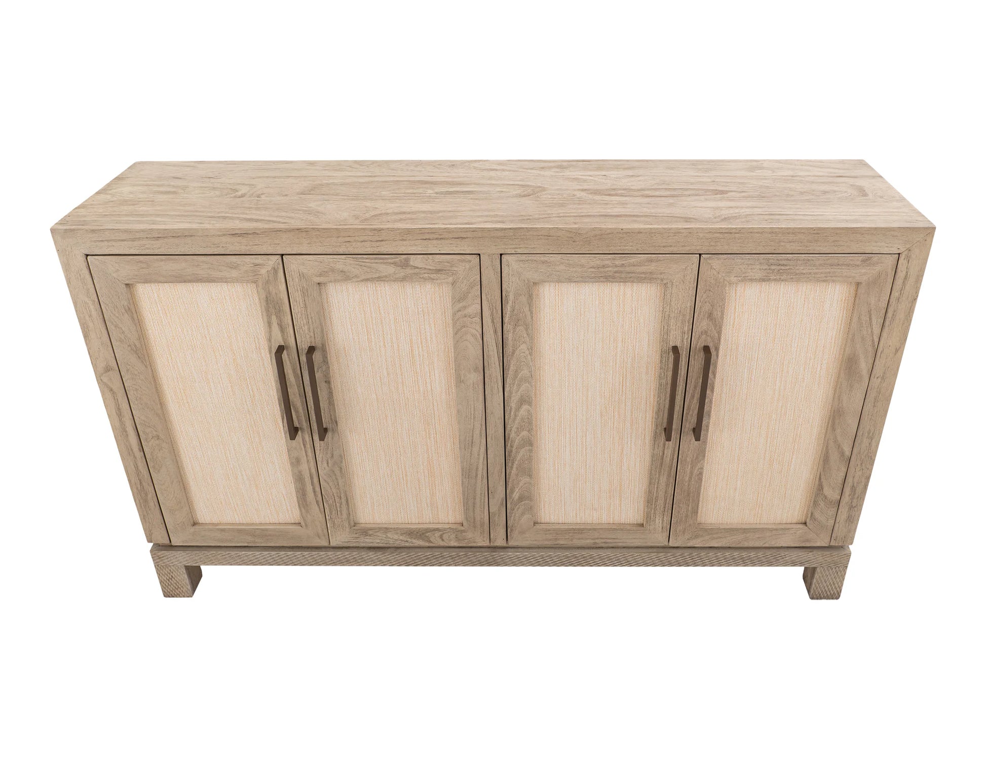 4 Door, Console. Bring warmth and character to your home with the Solara Console, expertly handcrafted from solid Melina wood and finished in a white lacquer. The door panels are adorned with woven yucca fiber, and the base features CNC-machine textured, providing a touch of organic charm and elegance. It features two shelves for practical storage and custom metal pulls; the Solara seamlessly combines artistic details with functional design, crafted to be cherished for a lifetime.